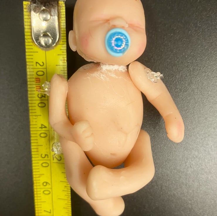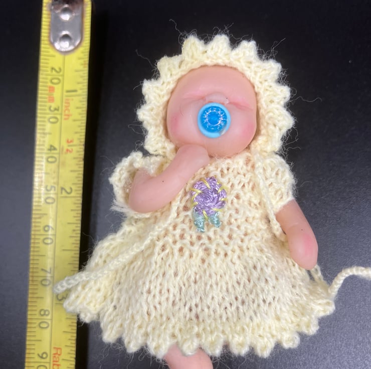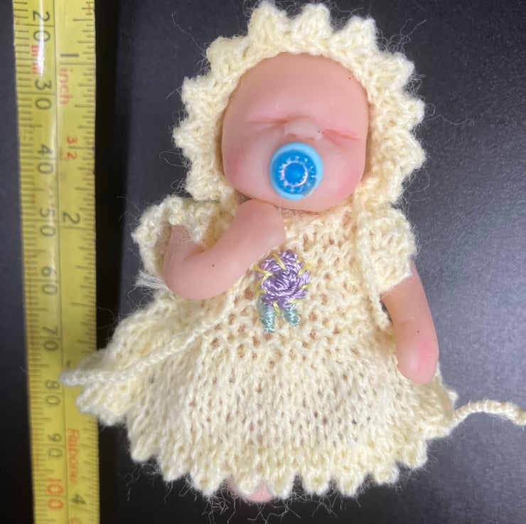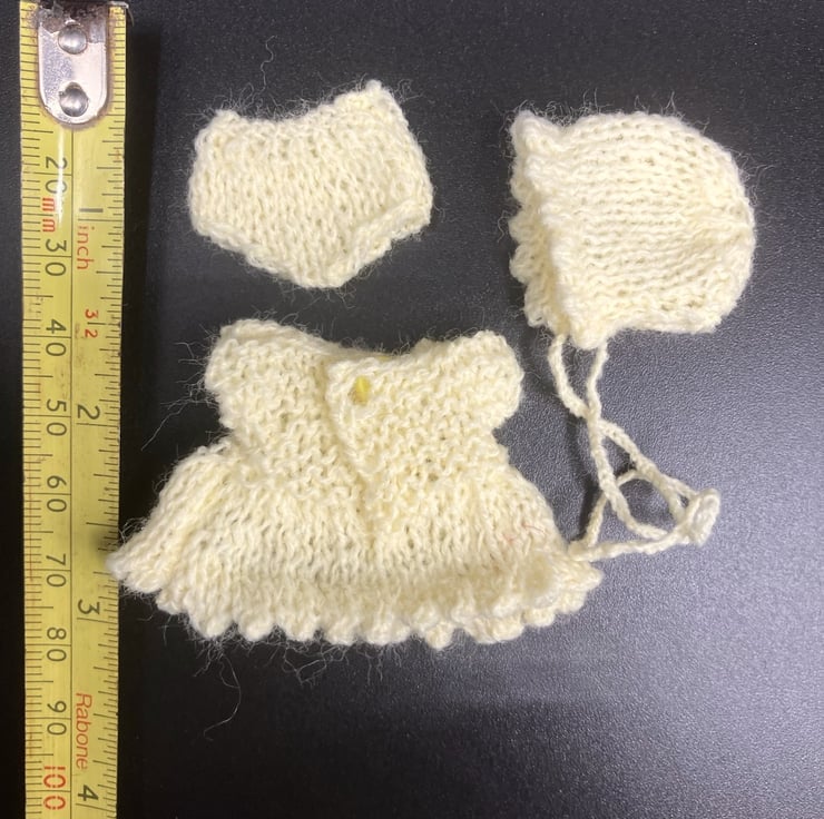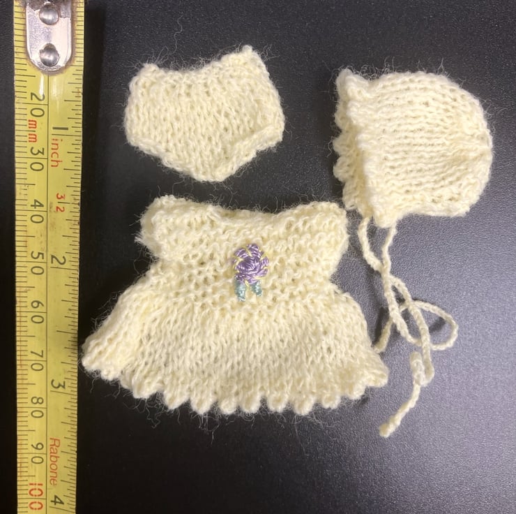 The doll is not included - my models were purchased on Etsy and Ebay. Tiny, hand knitted outfit for a polymer clay baby doll, comprising dress, bonnet with ties and pants. The dress opens at the back and fastens with a 3mm button so it can be put on and off the doll easily. The doll (not included) measures approx 7.5cm (3 inches) tall and the dress measures approx 4cm (1 1/2 inches) from shoulder to hem.