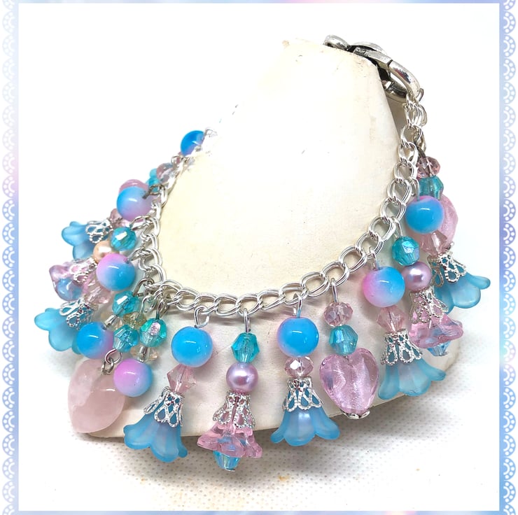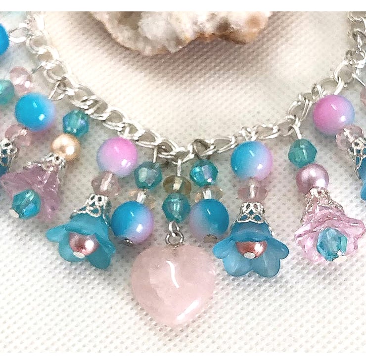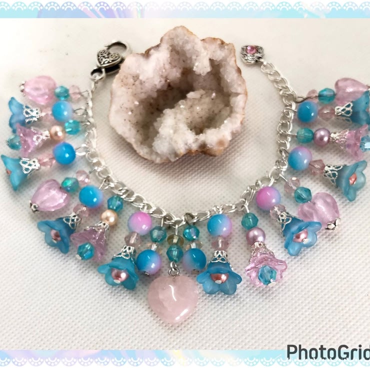 Created using Lucite & glass flowers, lampwork hearts with a focal Rose Quartz heart. Two tone beads & bead caps. Nickel free