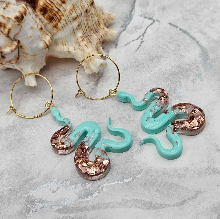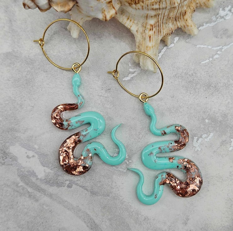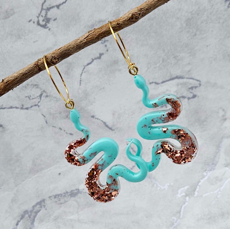 Unleash your wild side with these captivating resin snake earrings. The striking turquoise colour and sparkling copper glitter create an exotic, eye-catching aesthetic that's sure to turn heads, Whether you're dressing up or adding a touch of flair to your everyday look, these serpent earrings will elevate your style with their mythical, nature inspired allure.