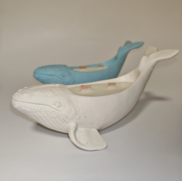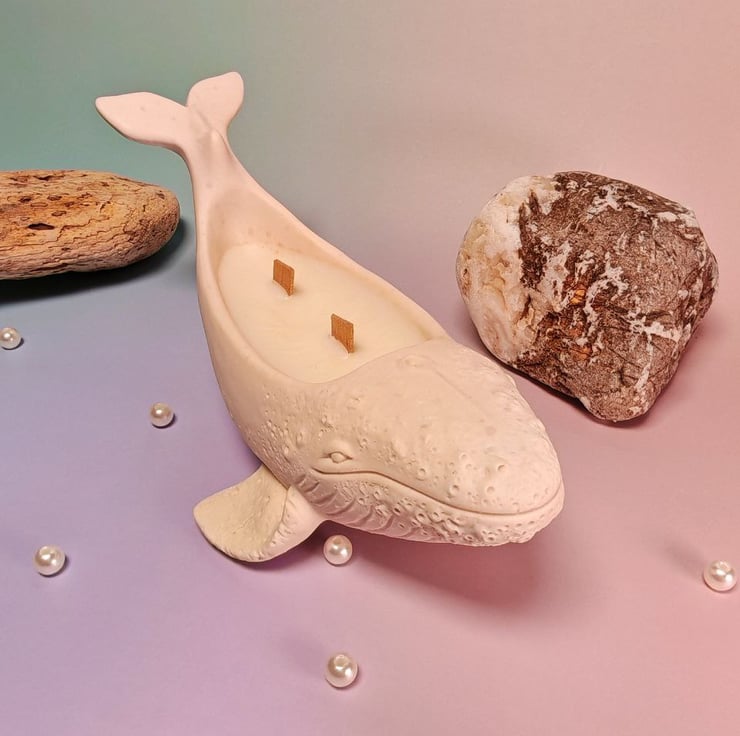 A handmade whale candle made from soy wax.