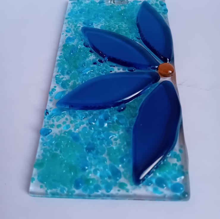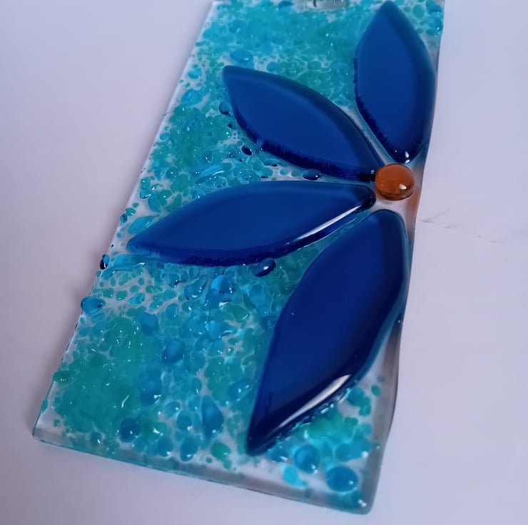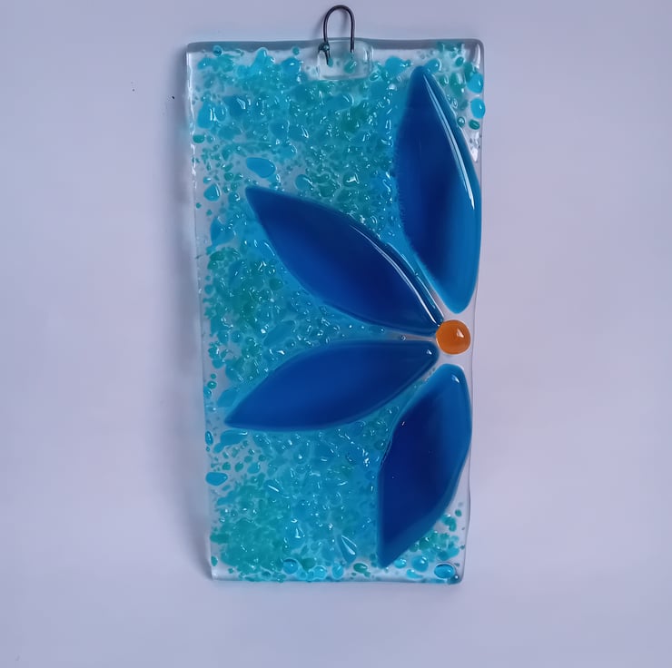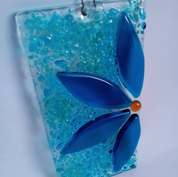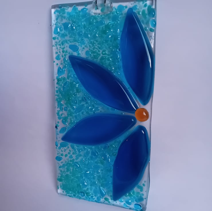 Individually handcut petals make up this half flower suncatcher. Fused along with sprinkles of ground glass in the background make for an item that catches the light beautifully to show off the vibrant colours.