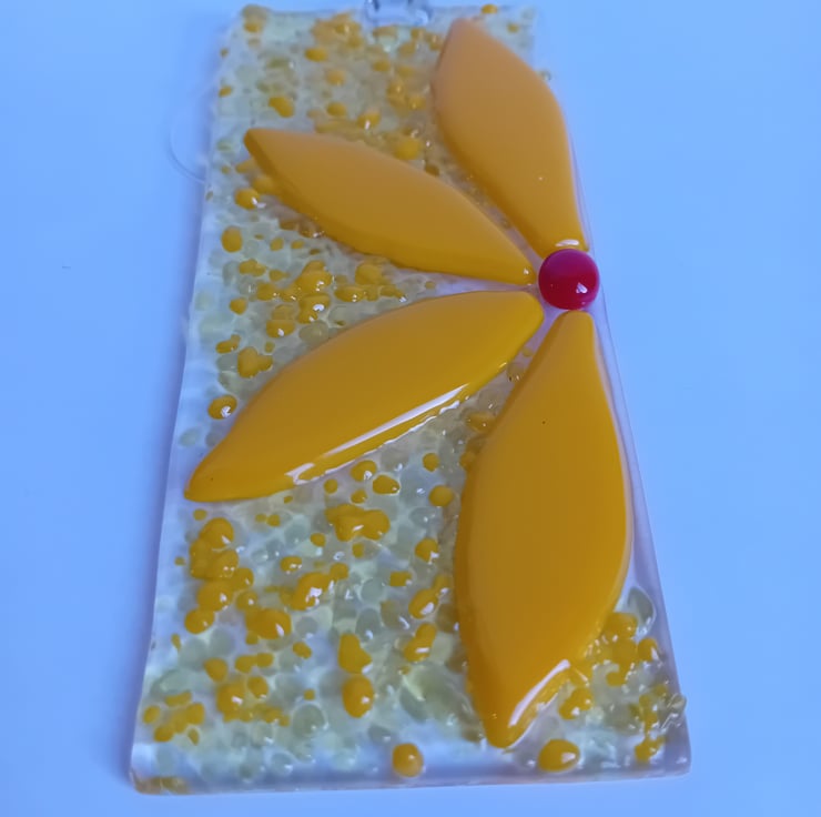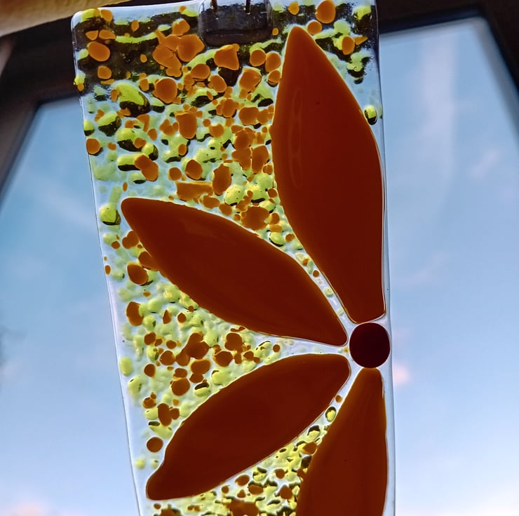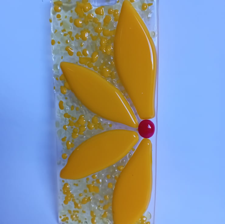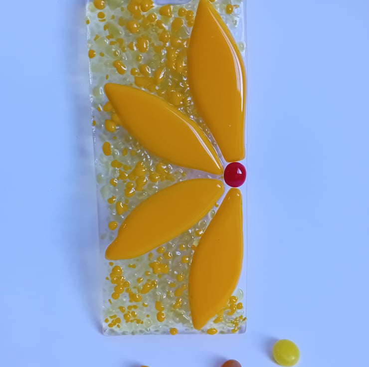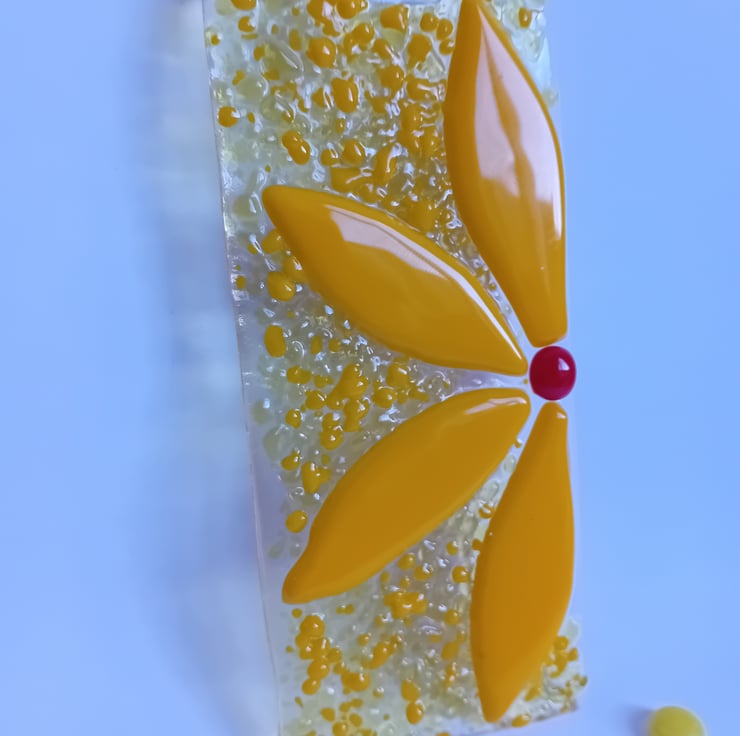 Add a bit of sunshine into your day! This bright and cheerful yellow half-flower suncatcher is made by individually cutting petals by hand and fusing them along with sprinkles of ground glass. The background glass has different shades of yellow with different levels of light transission make for an item that catches the light beautifully to show off the vibrant colours.