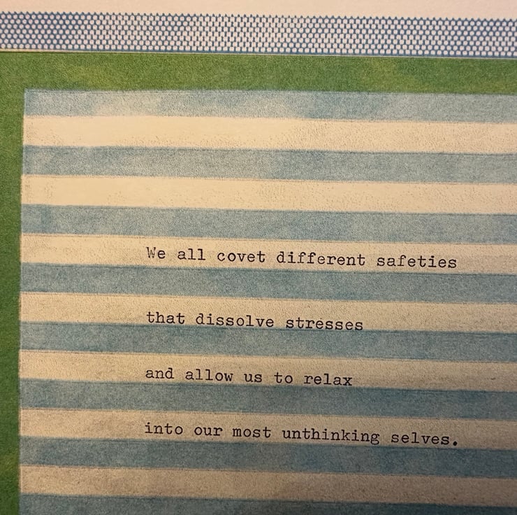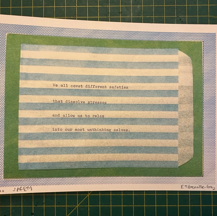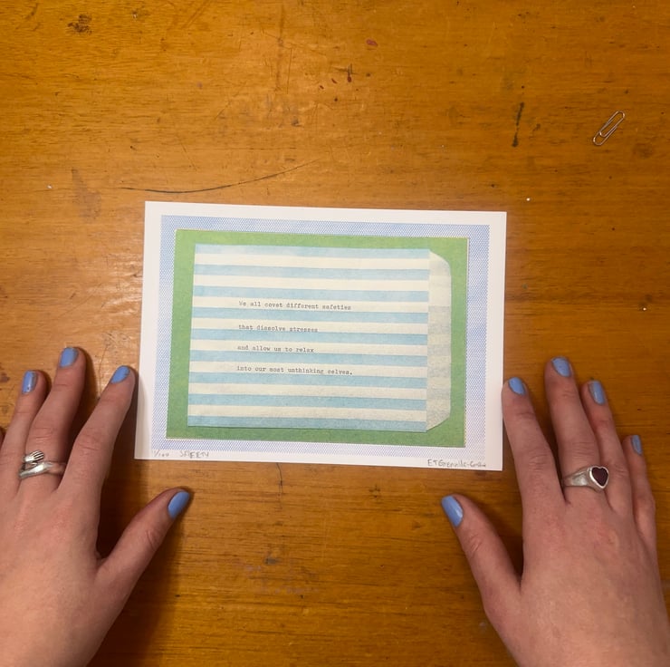 Explore the profound concept of safety with "Safety," an introspective A5 Risograph print that invites you to consider what it means to feel secure and at ease. This striking artwork features a light blue background with a calming green border, creating a soothing visual experience that complements the thoughtful message.