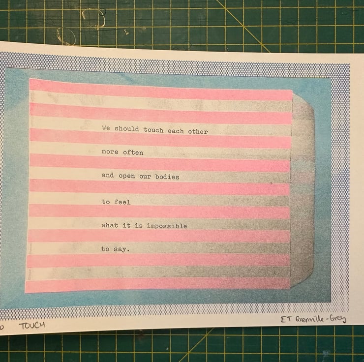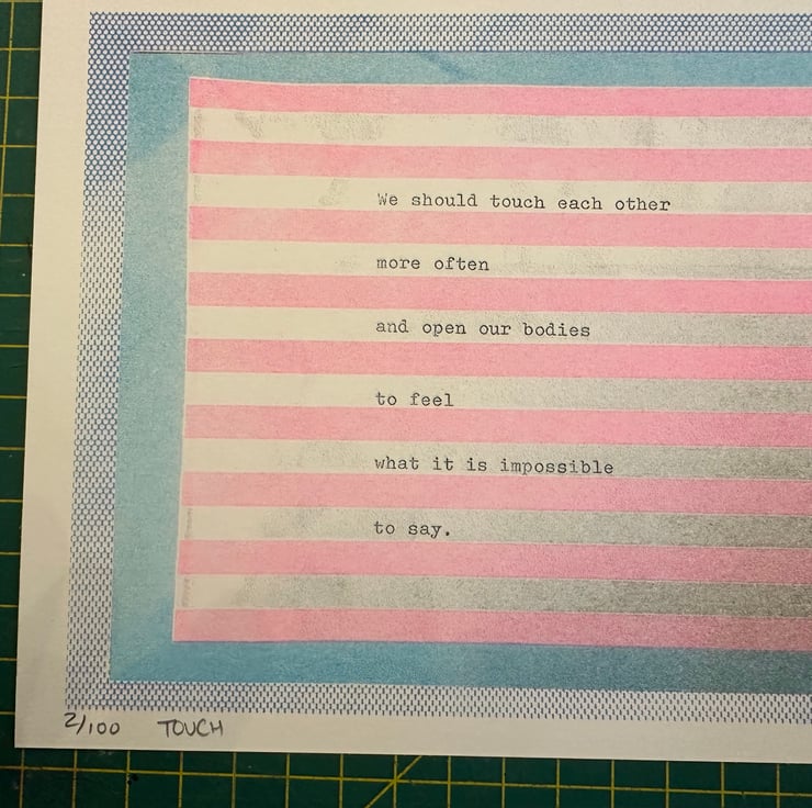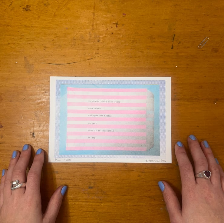 Experience the beauty of human connection with "Touch," a poignant A5 Risograph print that invites you to explore the depths of emotional expression. This striking artwork features light pink stripes on a soft baby blue background, enhancing the intimate nature of the message and drawing viewers into a moment of reflection and connection.