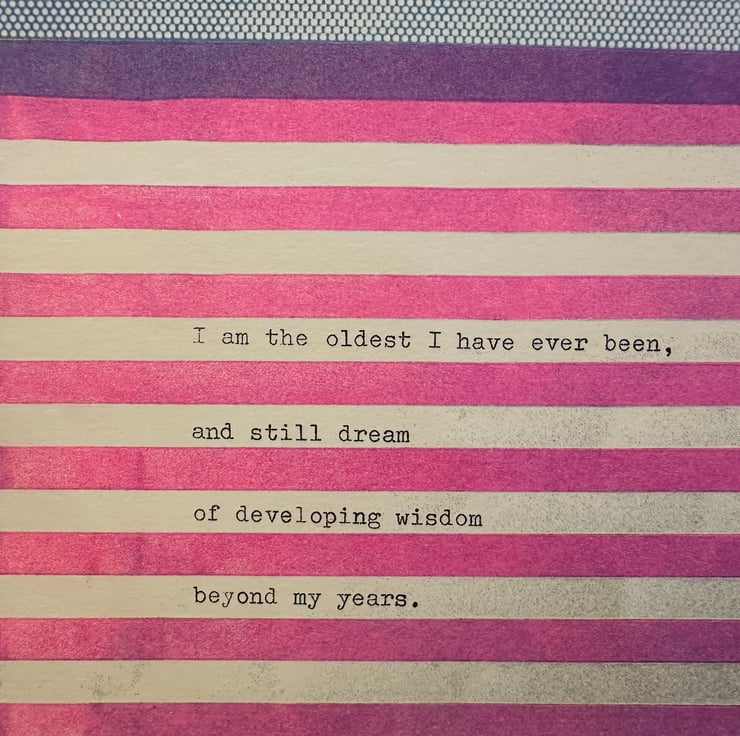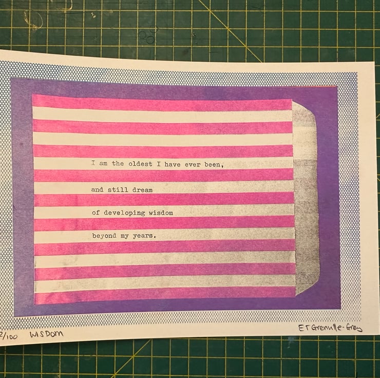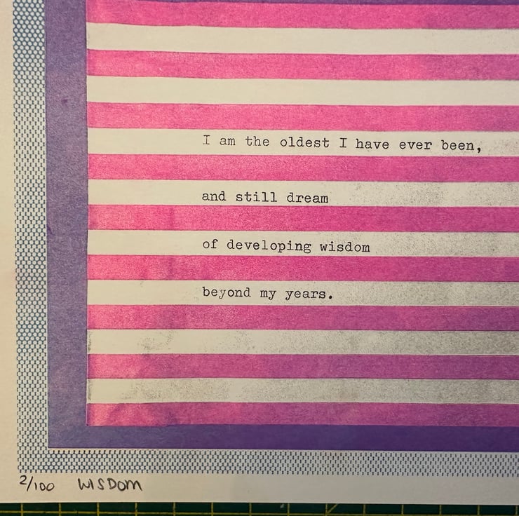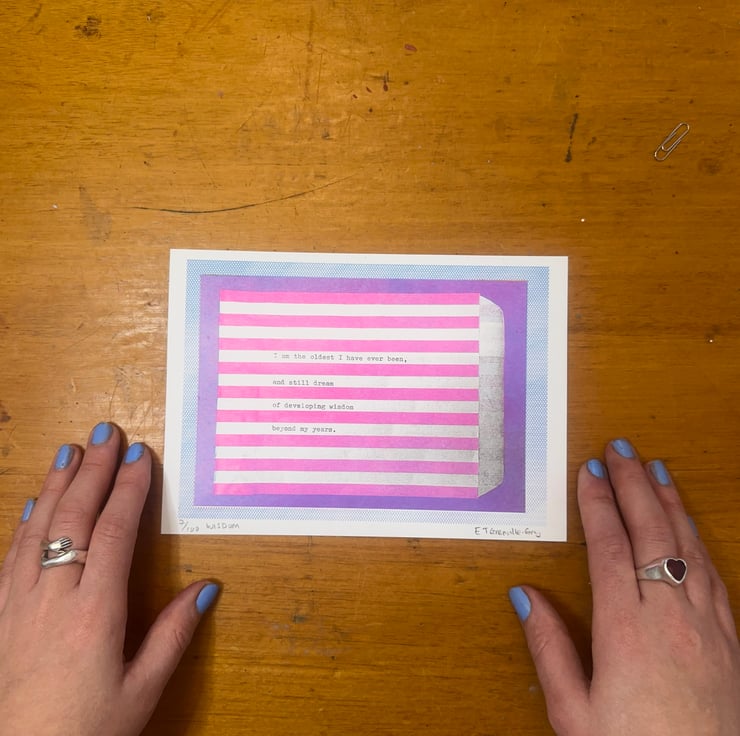 Dive into the depths of personal growth with "Wisdom," an exquisite A5 Risograph print that invites you to reflect on the nature of wisdom and the passage of time. This captivating artwork features a striking design in shades of purple-pink, set against a darker purple background, complemented by a bold blue border. One of the inks used is a vibrant fluorescent pink, giving the piece a luminous quality unique to Risograph printing.