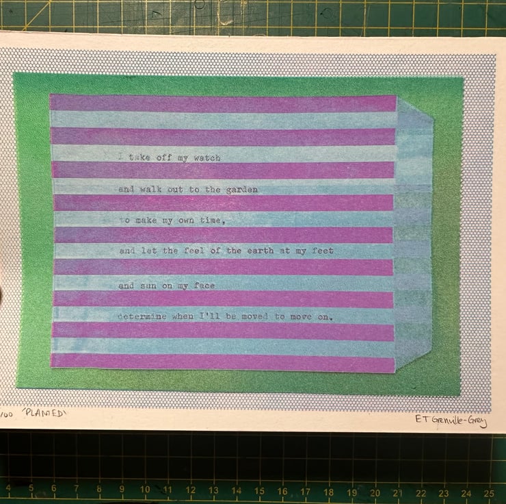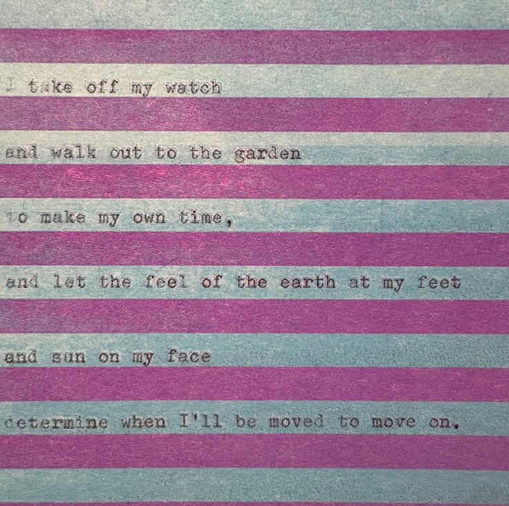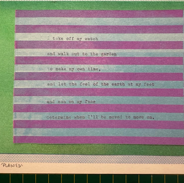 Experience the serene beauty of surrendering to nature's pace with our "Planted" A5 Risograph art print. Featuring the typewriter text "I take off my watch and walk into the garden and let the feel of the earth at my feet and the sun on my face determine when I’ll be moved to move on," this piece invites you to embrace the simplicity and tranquility of being present in the moment.