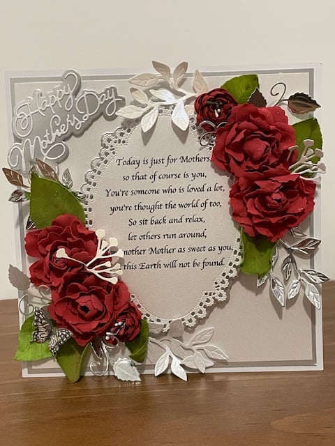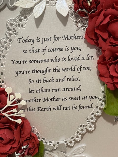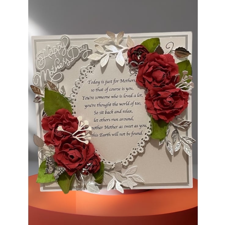 The card design celebrates the recognition of Mothers and Motherhood. The arrangement of the card starts with a high quality, white card base, the composition elements of the card tell the story through its 3d structure right through to the flowers and completed with a poetic composition taking centre stage on the card front.