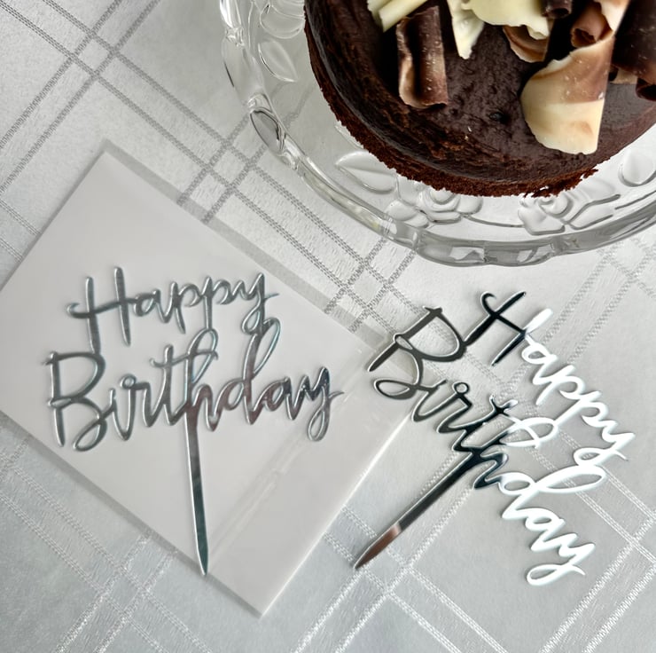 Make your celebration sparkle with this metallic silver acrylic “Happy Birthday” cake topper.