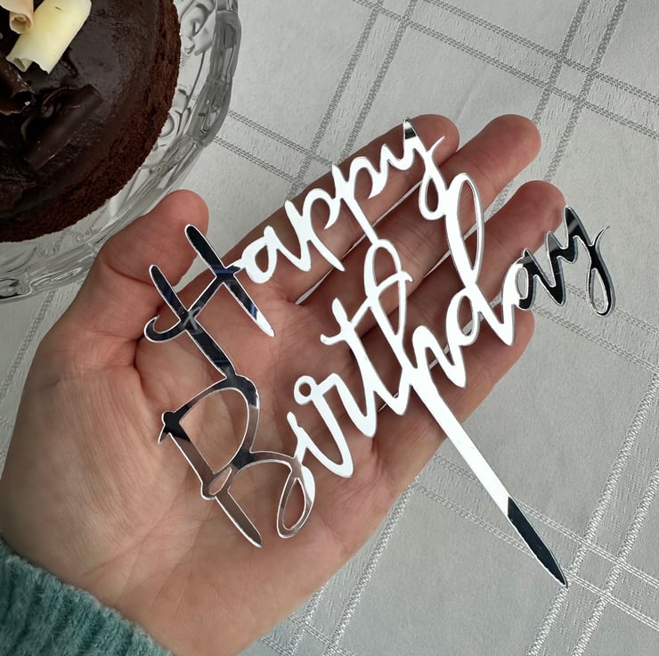 Elegant silver Happy Birthday cake topper