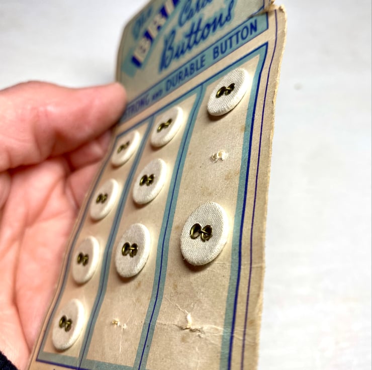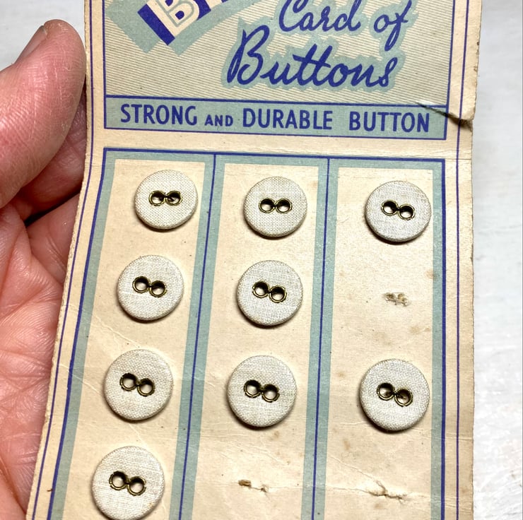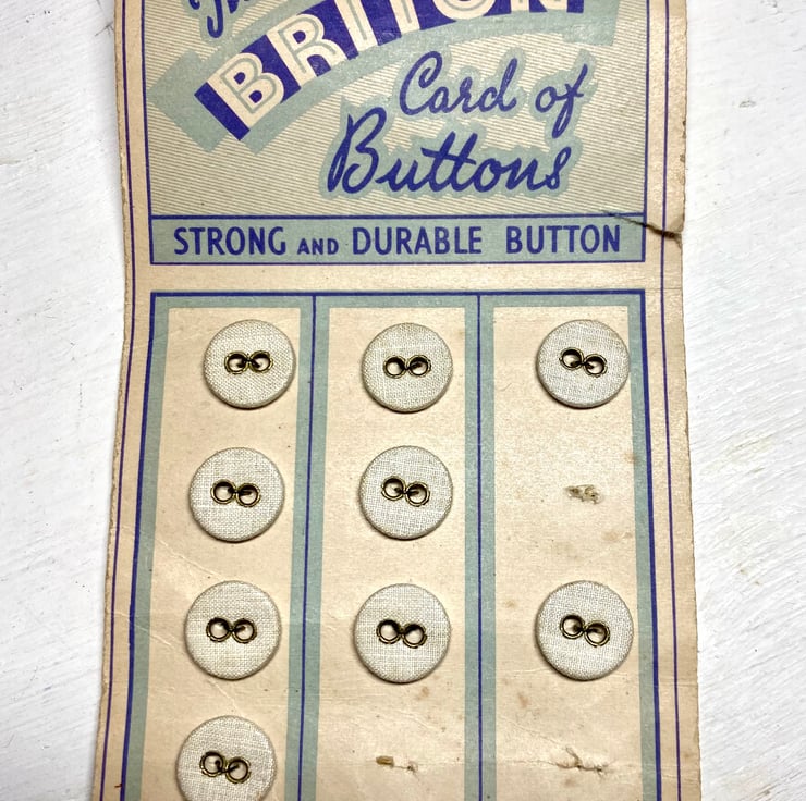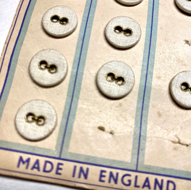 There’s nine buttons left on this card, they are in beautiful condition, metal, fabric covered 2 hole vintage shirting buttons.
