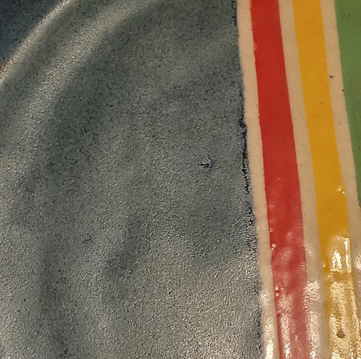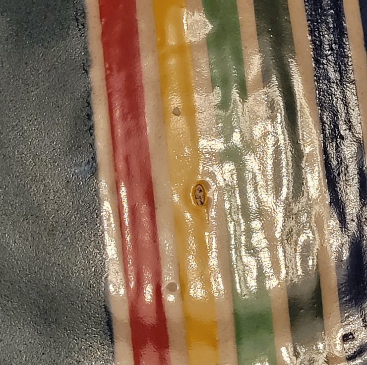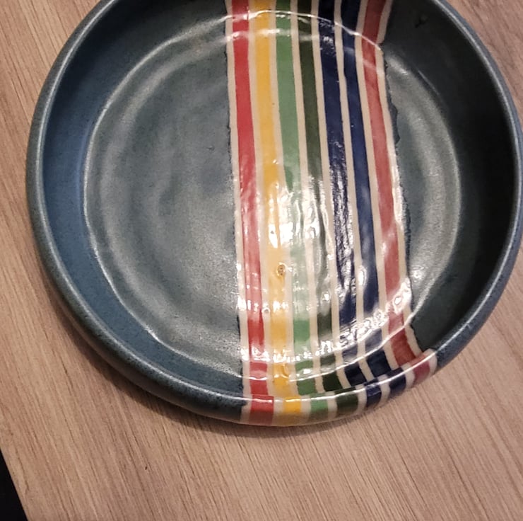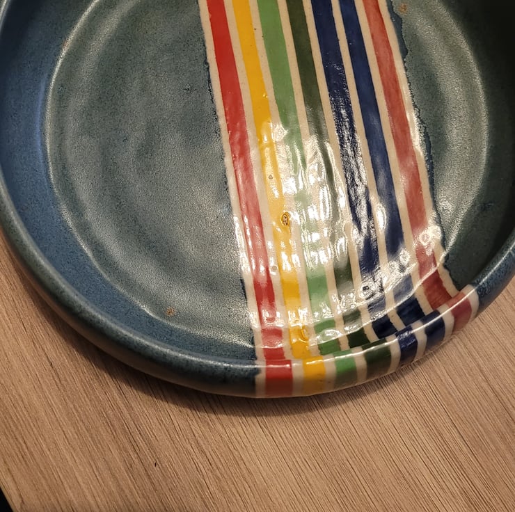 Thrown on the wheel, this bowl has got a speckled blue glaze applied to the internal and external surfaces with a rainbow stripe across the middle of the piece. See pictures for slight glaze variations on the inner surface It has a diameter of 16cm and a height of 4cm.