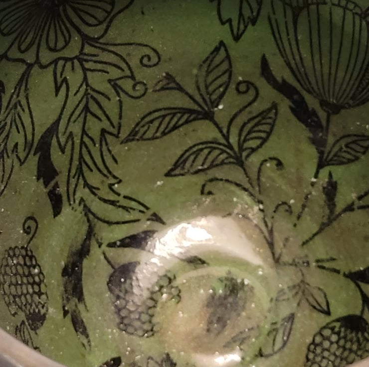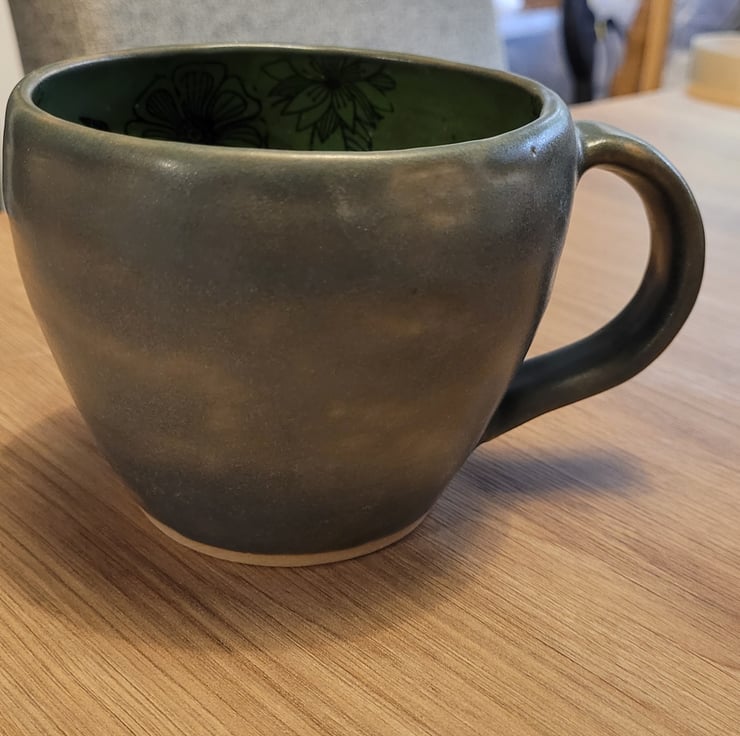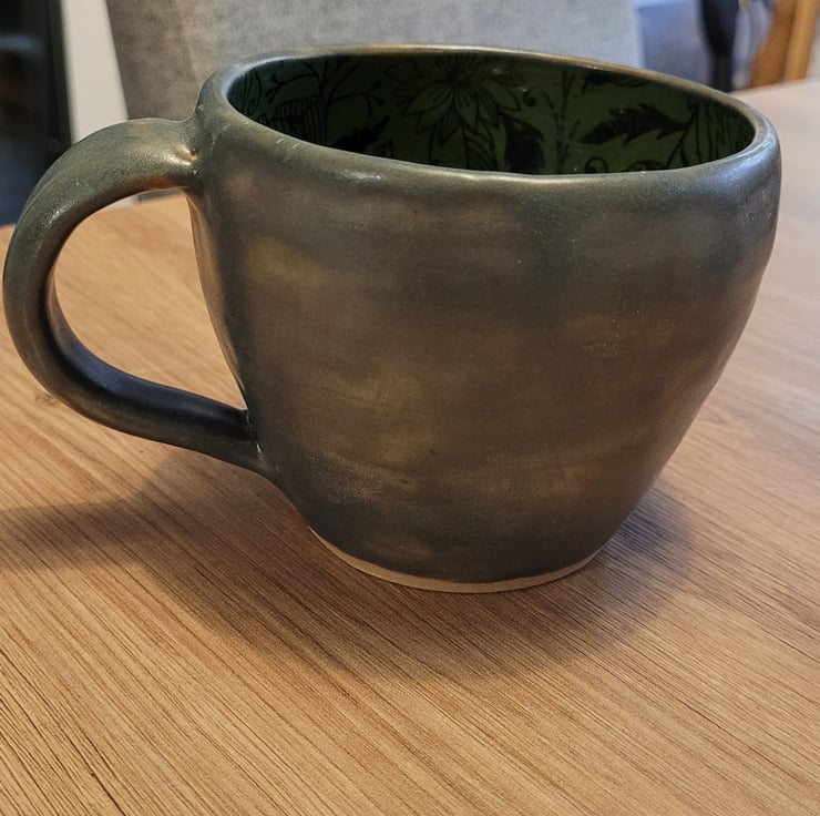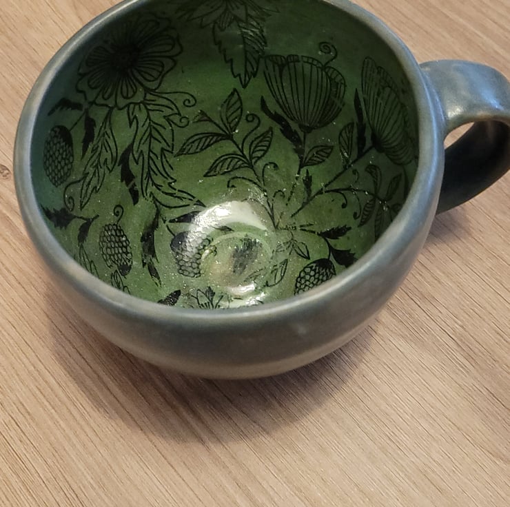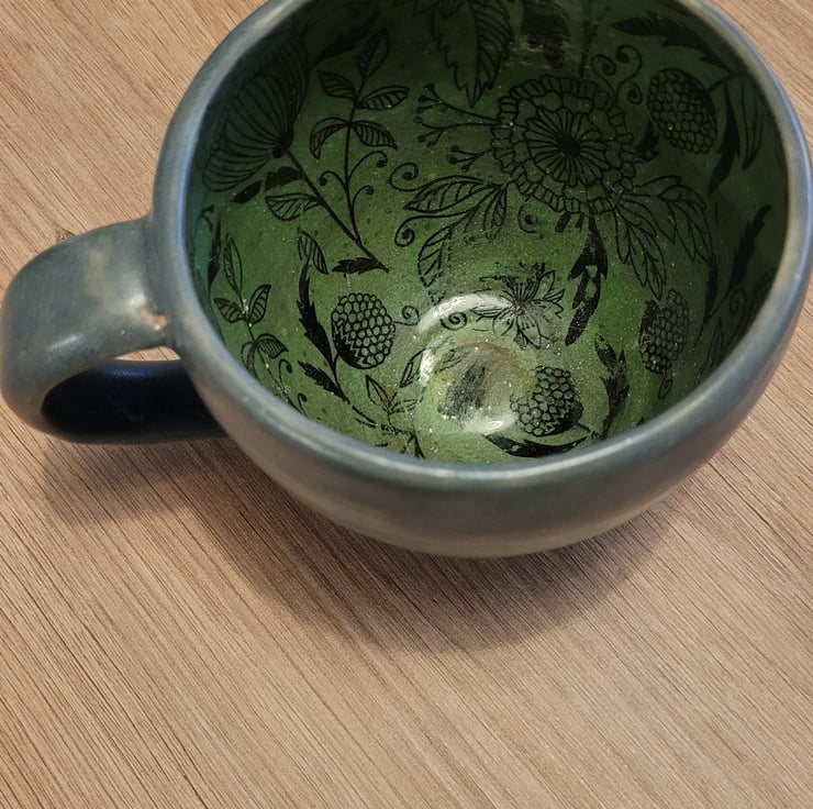 Thrown on the wheel, this mug has a grey- blue satin finish glaze applied to it's external surface. It's internal surface is green with a printed plant/leafy pattern on it. This mug has a capacity of approximately 250ml.