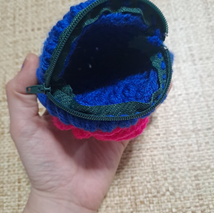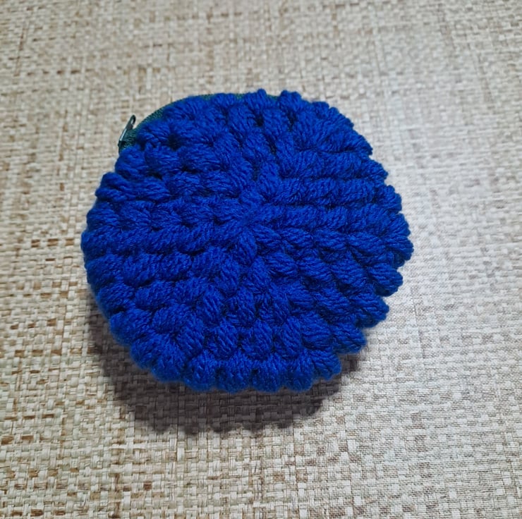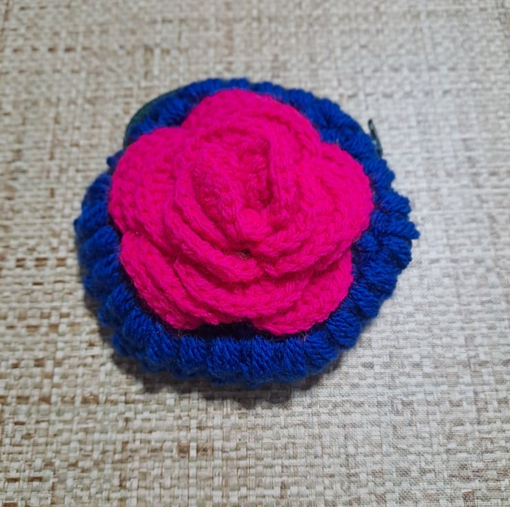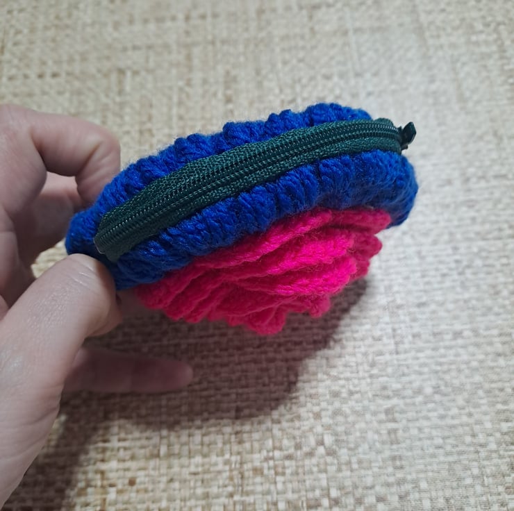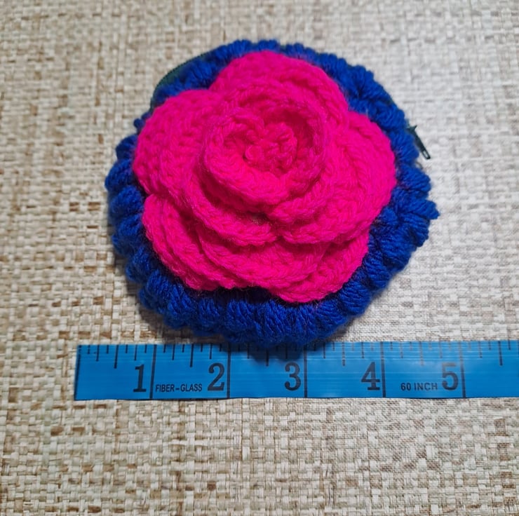 royal blue crochet round purse with pink crochet rose design on the front. Zipper on the top. plain back.