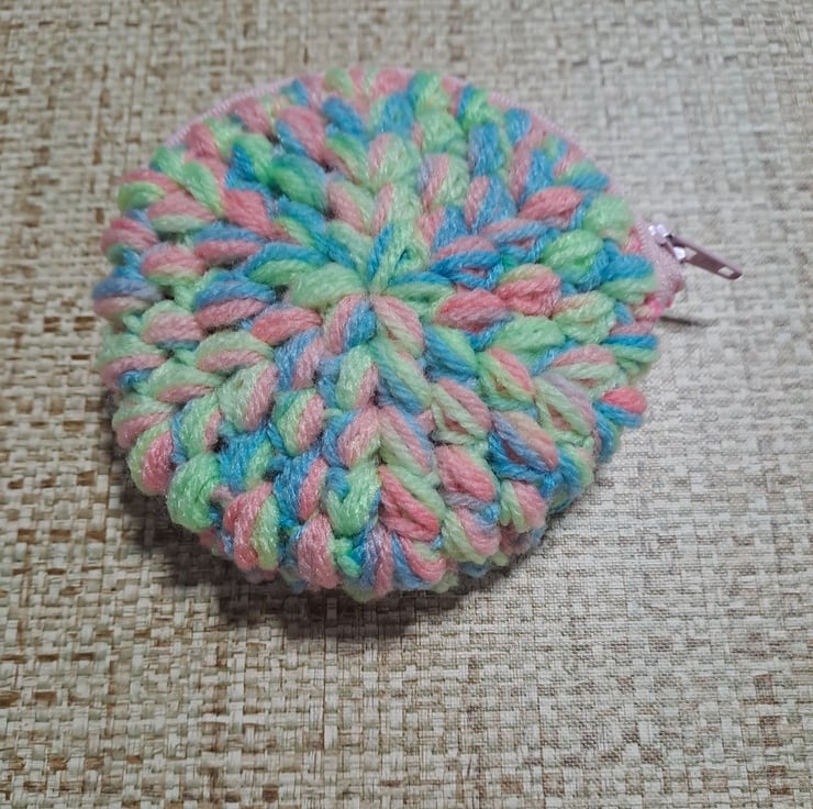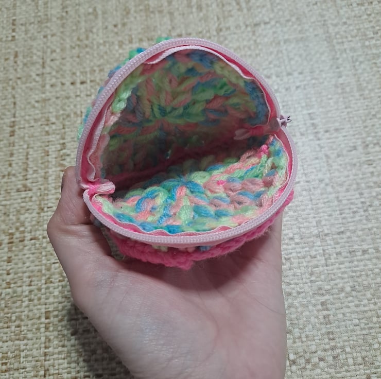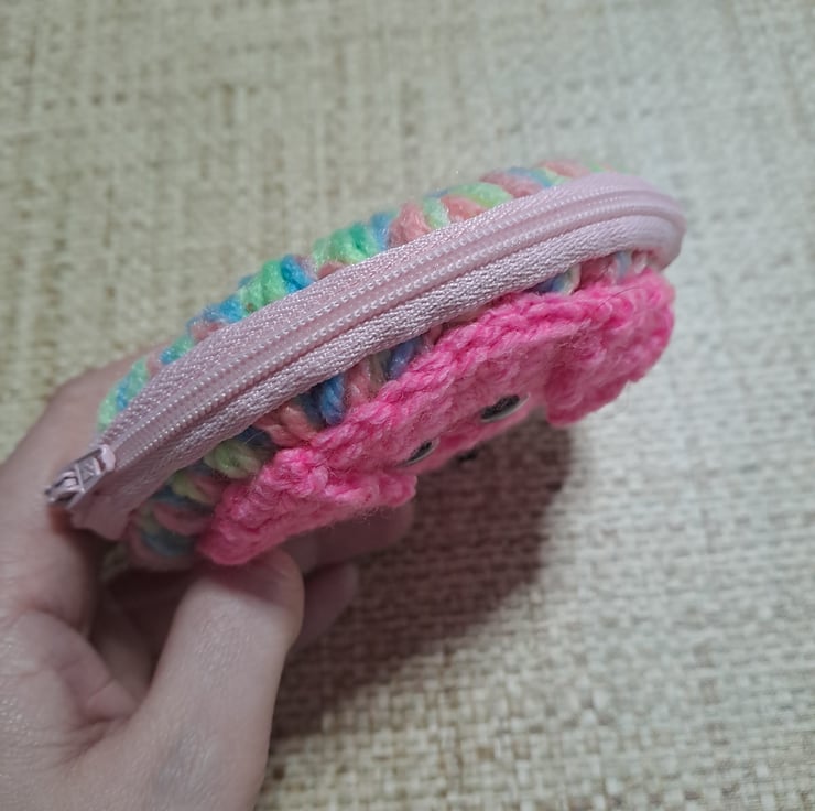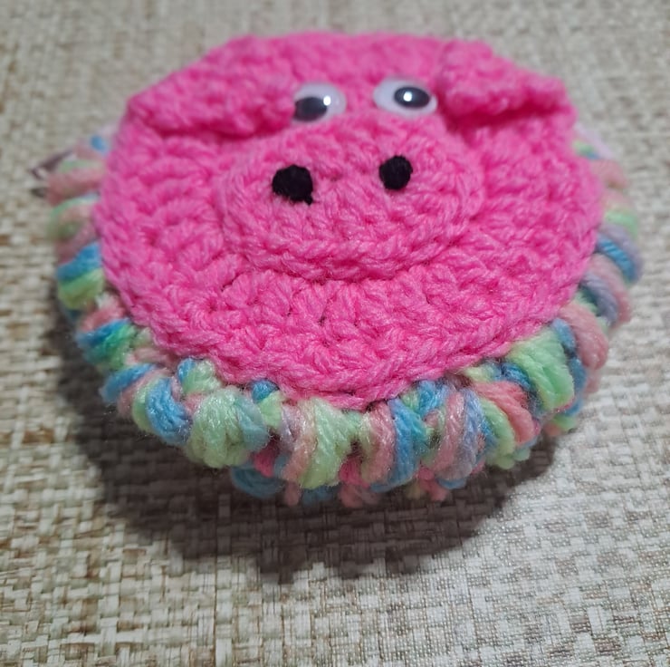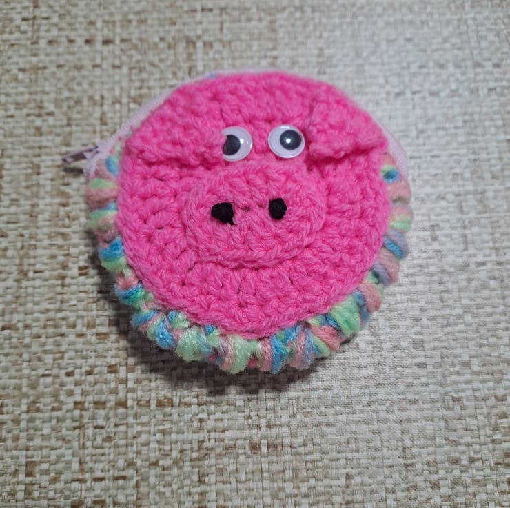 multicoloured crochet purse with pink piggie face on the front. pink zipper on the top.