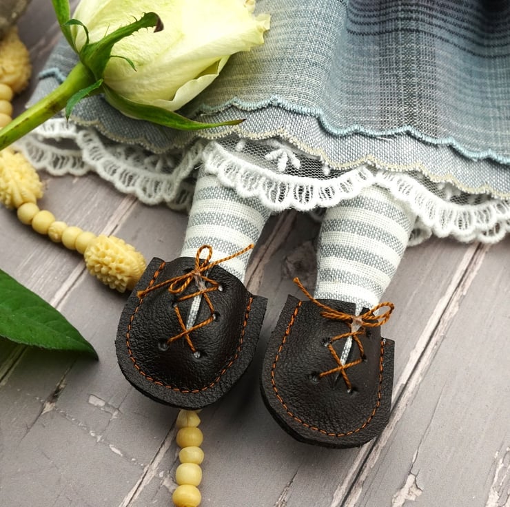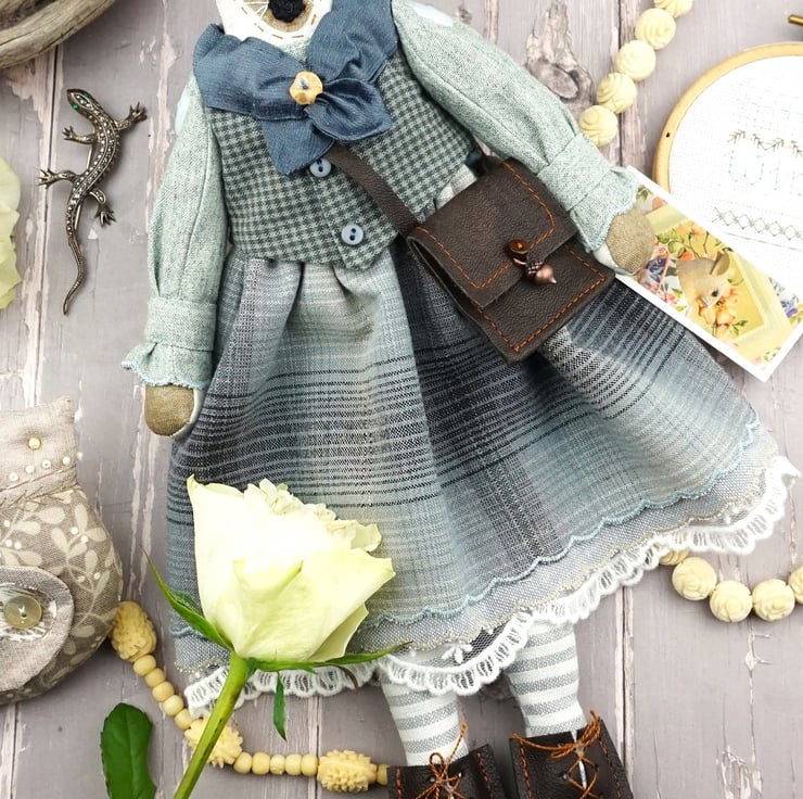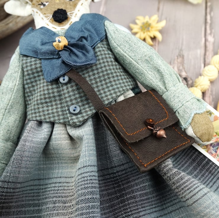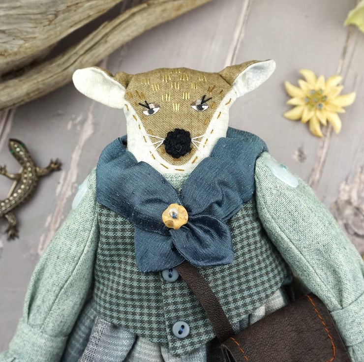 She has lavender in her stuffing, hand painted and embroidered features. She has an amethyst crystal at her heart for warmth and is finished with tiny buttons, a foraging bag in leather with strong leather shoes for stomping through the woods