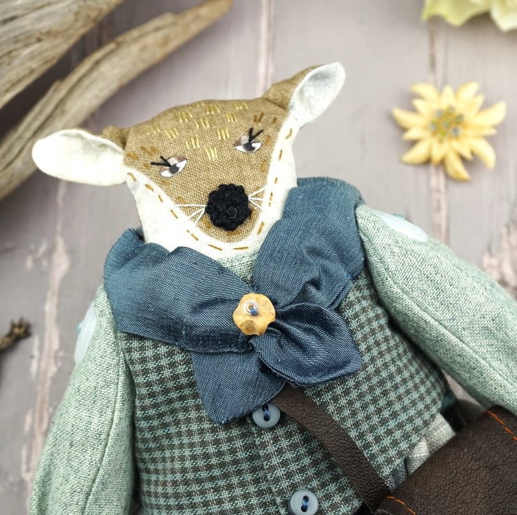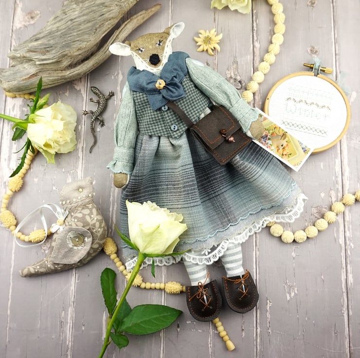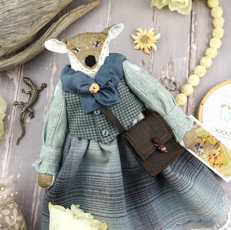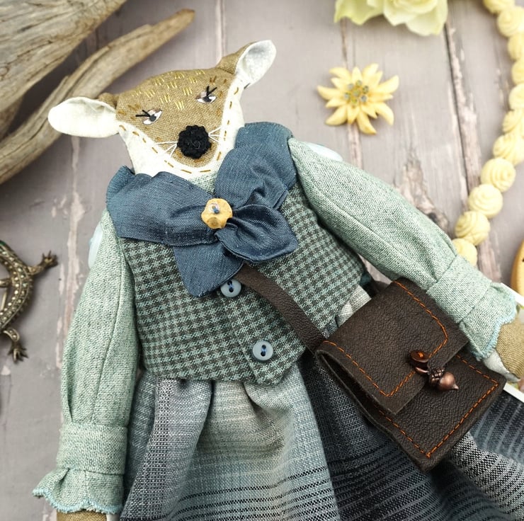 Asta is a tiny winter deer dressed in lovely blue tweedy yarn dye fabrics from Japan, coordinating blue yarn dye skirts, a smart cuffed shirt with a waistcoat. Her cravat is of deep blue grey silk with white tulle petticoats and white broderie anglais drawers.