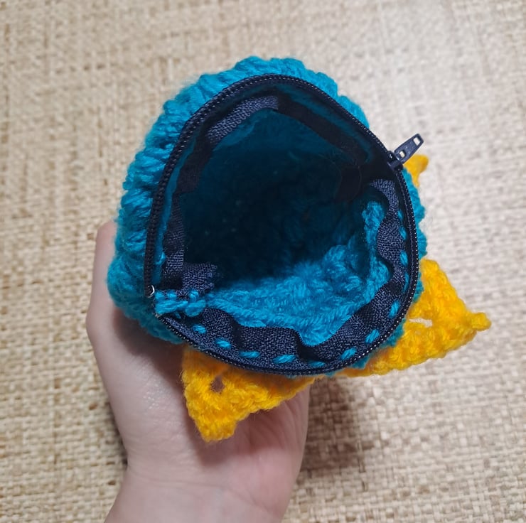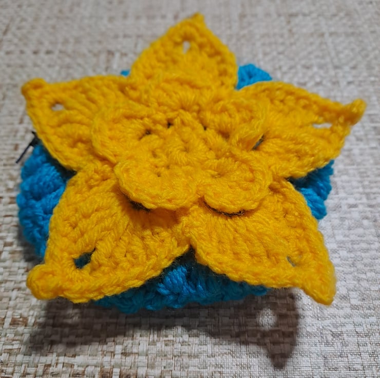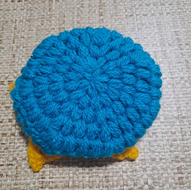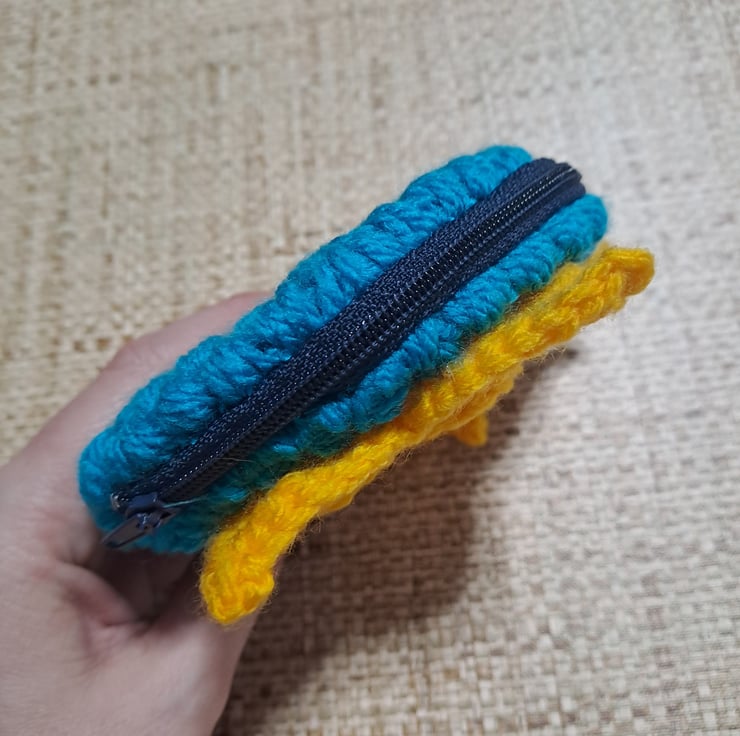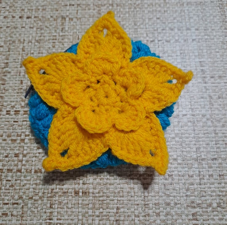 floral crochet purse. round blue purse with yellow crochet flower on the front. dark blue zipper.