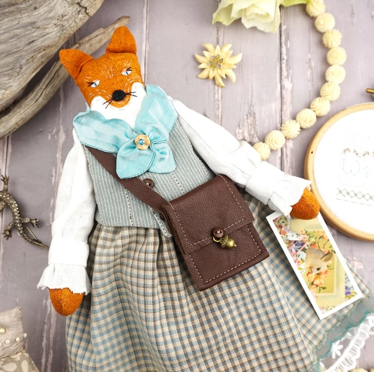 Astrid is a tiny winter fox dressed in lovely soft aqua tweedy yarn dye fabrics from Japan, coordinating aqua and fawn yarn dye skirts, a smart cuffed shirt with a waistcoat. Her cravat is of turquoise silk with white tulle petticoats and white broderie anglais drawers.