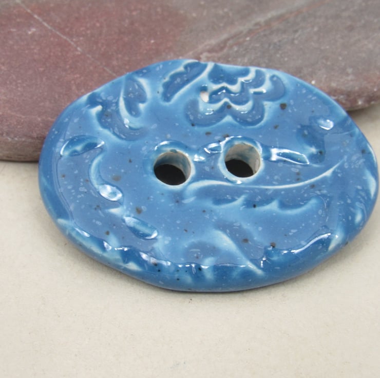 Medium oval shaped stoneware button, textured with a pretty brocade motif.