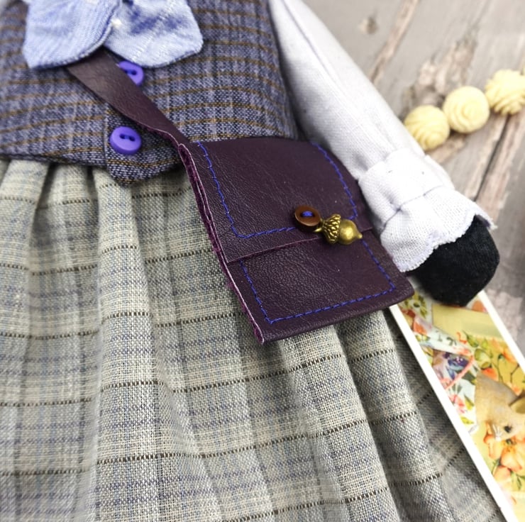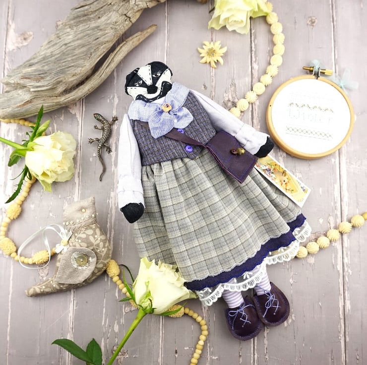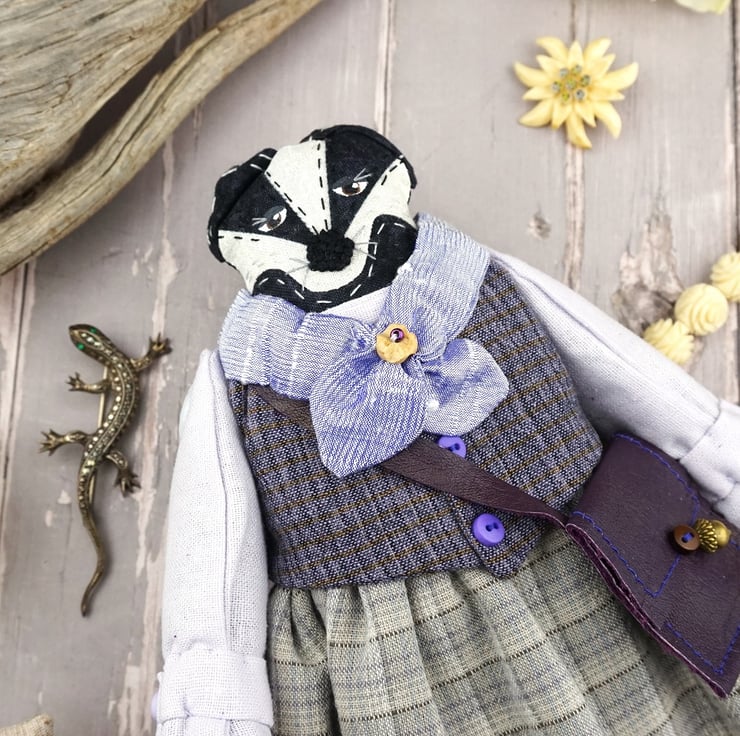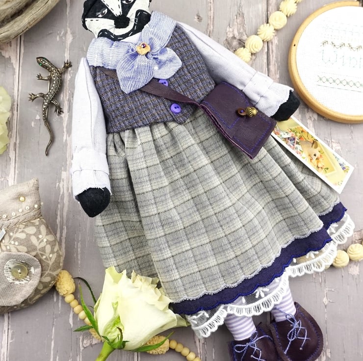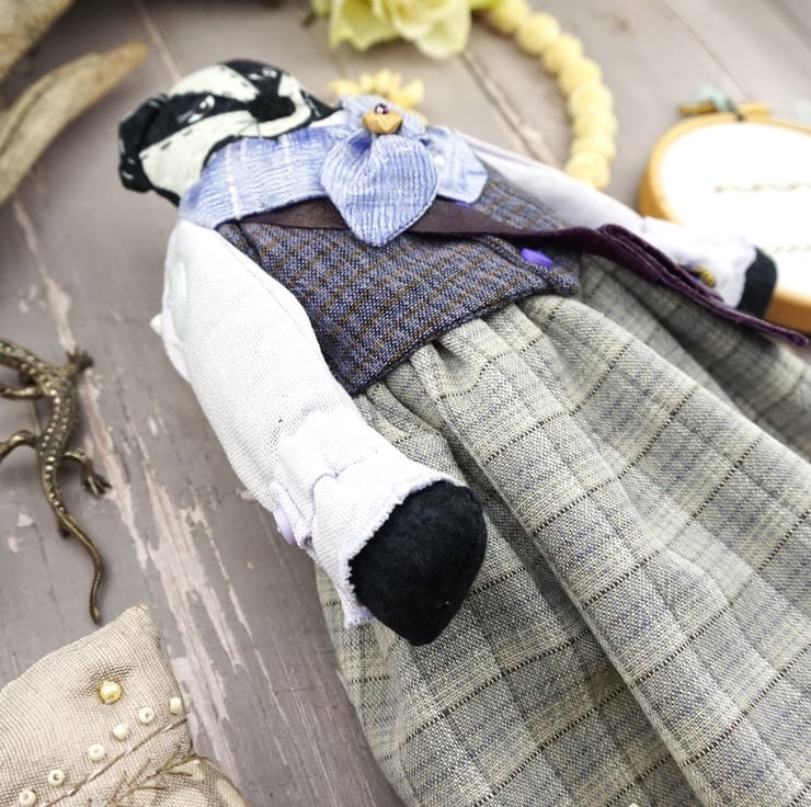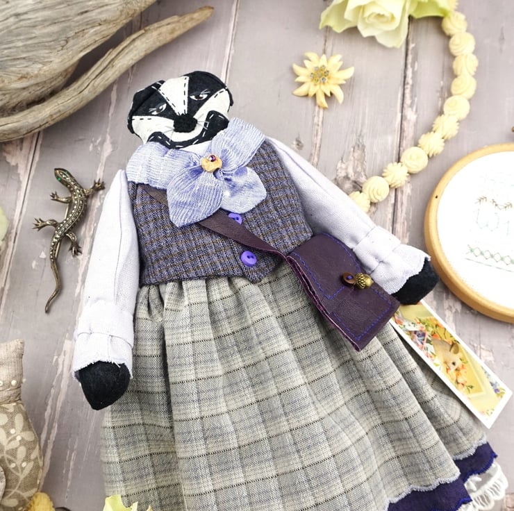 Freya is a tiny winter badger dressed in lovely soft purple tweedy yarn dye fabrics from Japan, coordinating lavender and fawn yarn dye skirts, a smart pale lilac cuffed shirt with a deep purple waistcoat. Her cravat is of lilac silk with white tulle petticoats and white broderie anglais drawers.