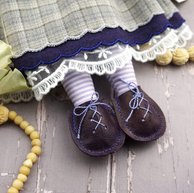 She has lavender in her stuffing, hand painted and embroidered features. She has an amethyst crystal at her heart for warmth and is finished with tiny buttons, a foraging bag in leather with strong leather shoes for stomping through the woods