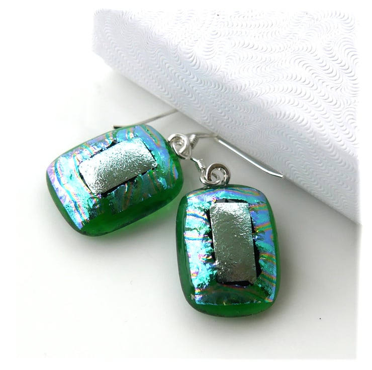 I've taken several photos of the earrings to try to show you the colour which changes in the light. this is a feature of wonderful dichroic glass. The last picture shows another 3 pairs made in the same batch and also available as separate listings.