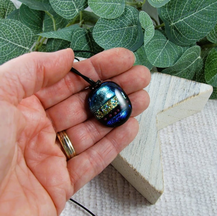 I made the dichroic glass cabachon by layering different glass together with copper beads and then kiln firing where the glass reaches melting point and forms an organic domed shape. I also add a small steel hoop which is embedded into the fired glass. This whole process takes around 7-8 hours. Once the glass was ready I wire wrapped the steel hoop with fine copper wire to form the hanging bail and fitted to black waxed cord with a sterling silver slider clasp and smaller silver beads.