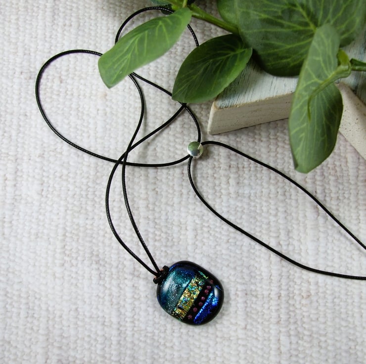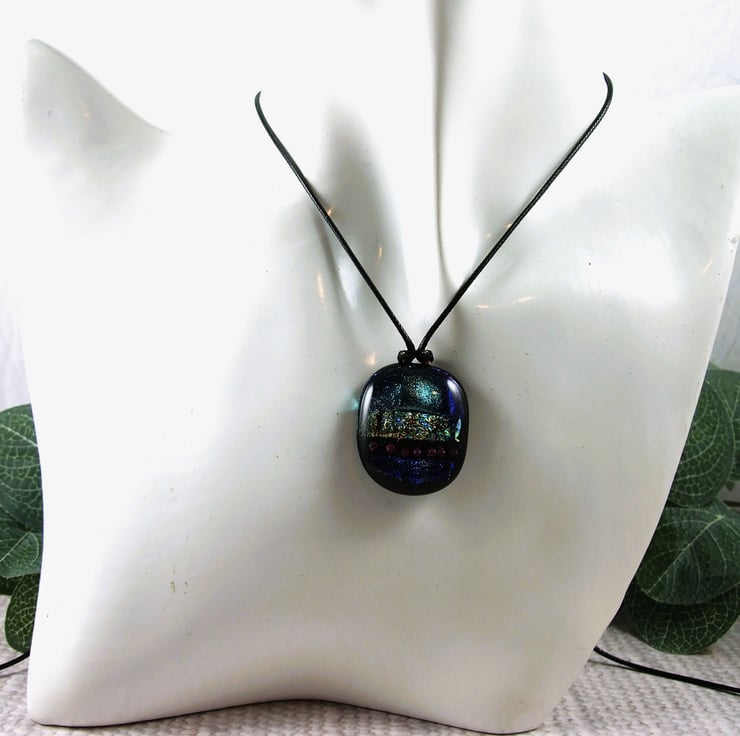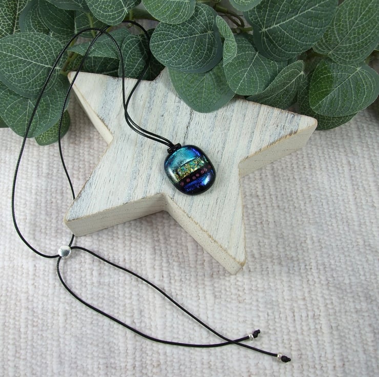 Abstract Dichroic Glass Pendant on black waxed cord with sterling silver slider clasp for an adjustable length.