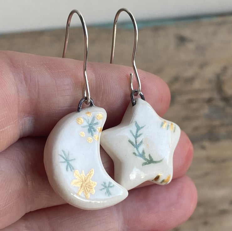 Dangly Earrings Handmade Mismatched Star and Moon ceramic