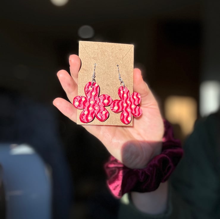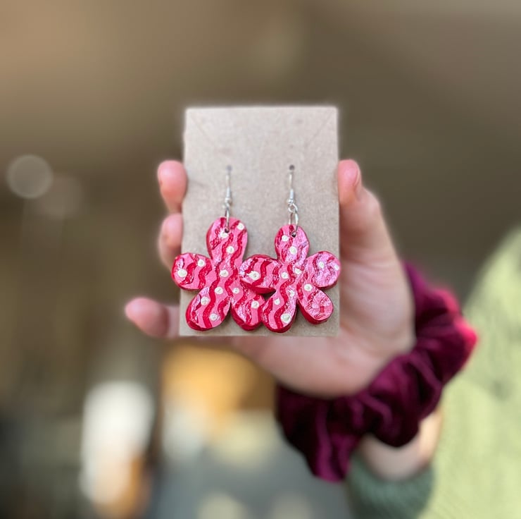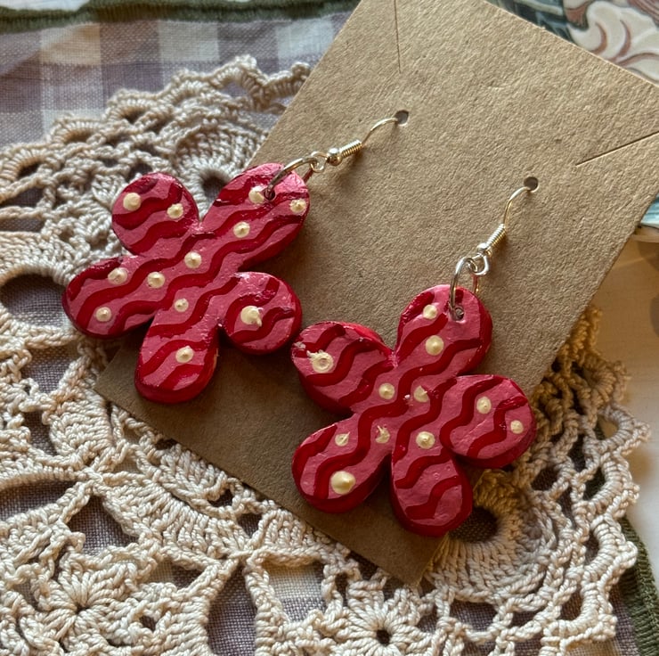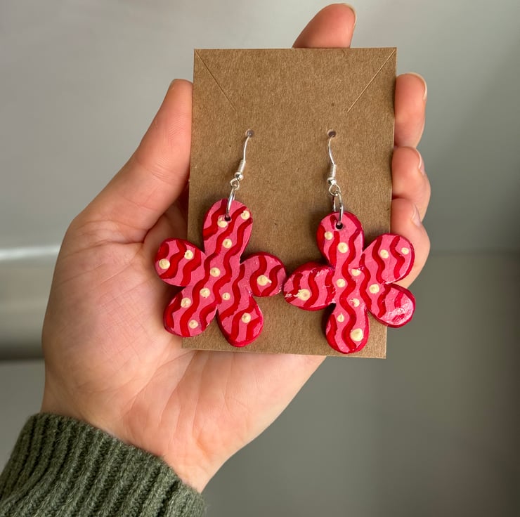 Handcrafted with care, these unique clay earrings feature delicate pink paint patterns that add a touch of charm to any outfit.