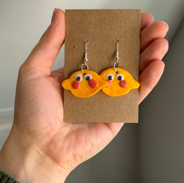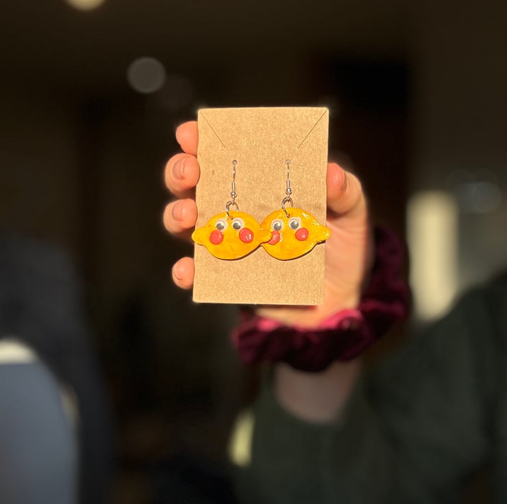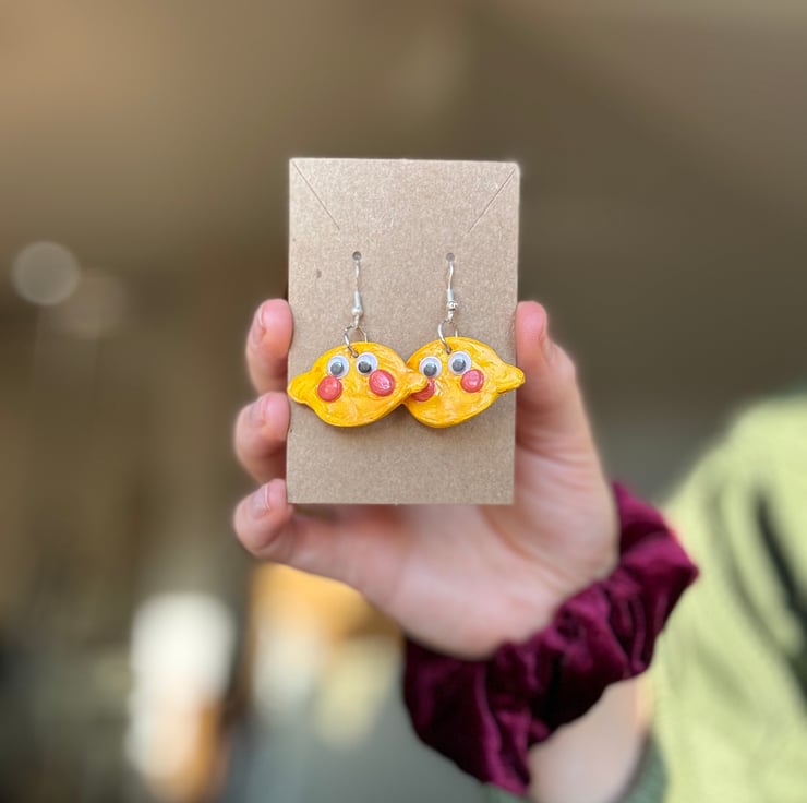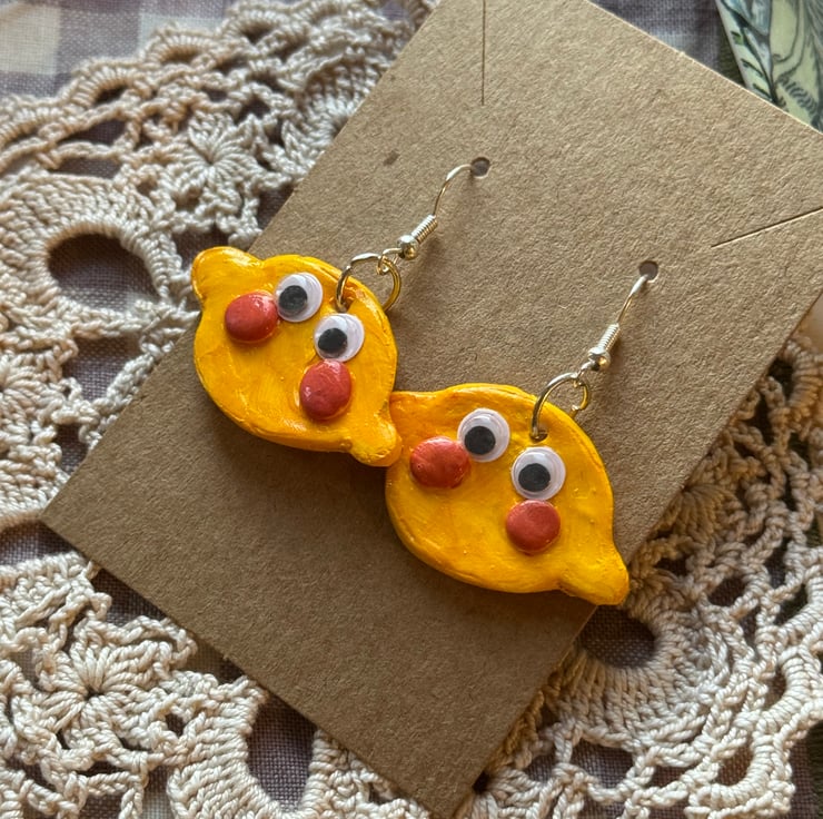 Brighten up your day with these adorable handmade lemon earrings! Crafted from clay and painted with cheerful yellow, they’re a sweet and sunny addition to any outfit. Made with hypoallergenic silver hooks, they’re perfect for sensitive ears. Lightweight and comfortable for all-day wear. Lovingly created by Ophelia.