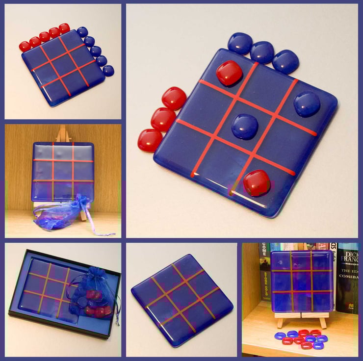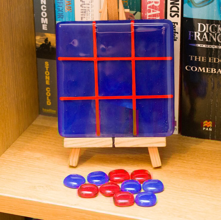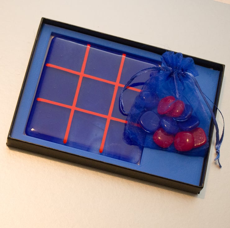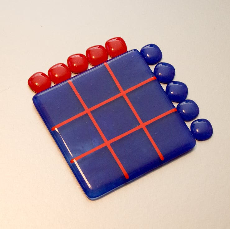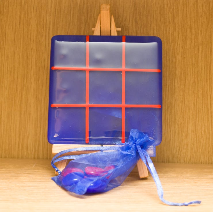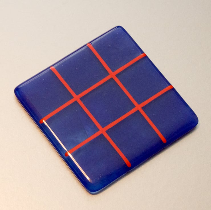We'll provide the grid on a 10 cm square coaster so you won't need to find pencil & paper.. The background is a Royal Blue with the grid made from Red stringers (thin glass rods).