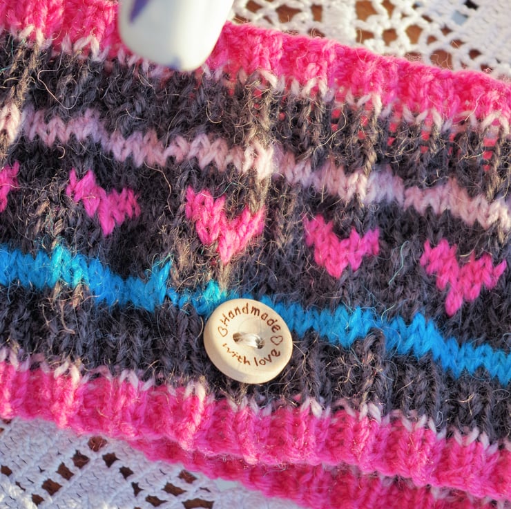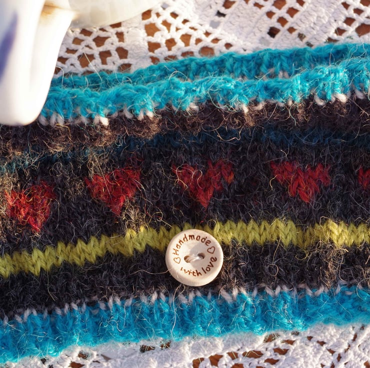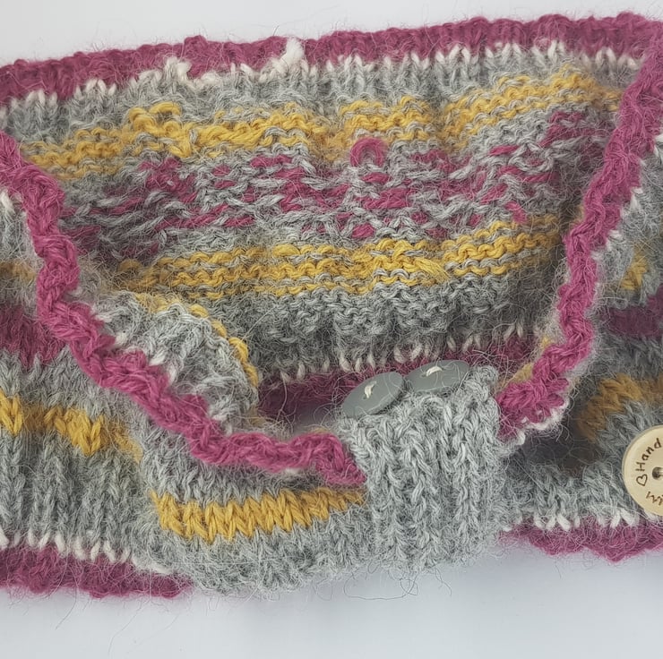 Hand knitted fairisle alpaca headband in drops extra soft fine 4 ply yarn. Genuinely hand knitted by myself from my own design with all threads knitted at the back for a neat finish. Available in 3 colourways blue and cream, pink and cream, grey and mustard or colours of your choice. These headbands are lightweight but warm.