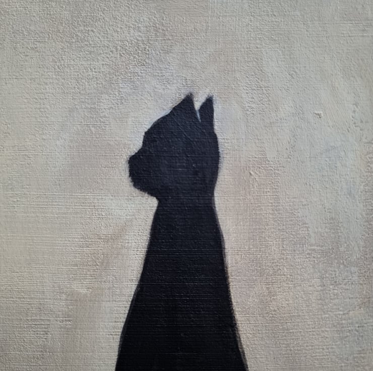 An original acrylic painting of a black cat on red carpet against a warm cream background. The artwork has visible brushstrokes & texture and is painted on sturdy greyboard.