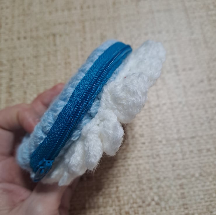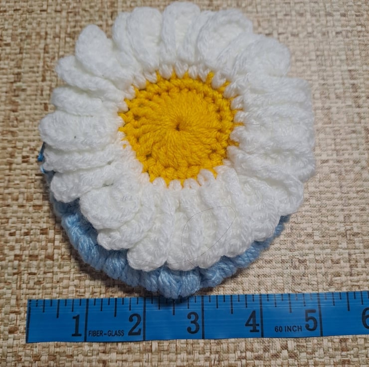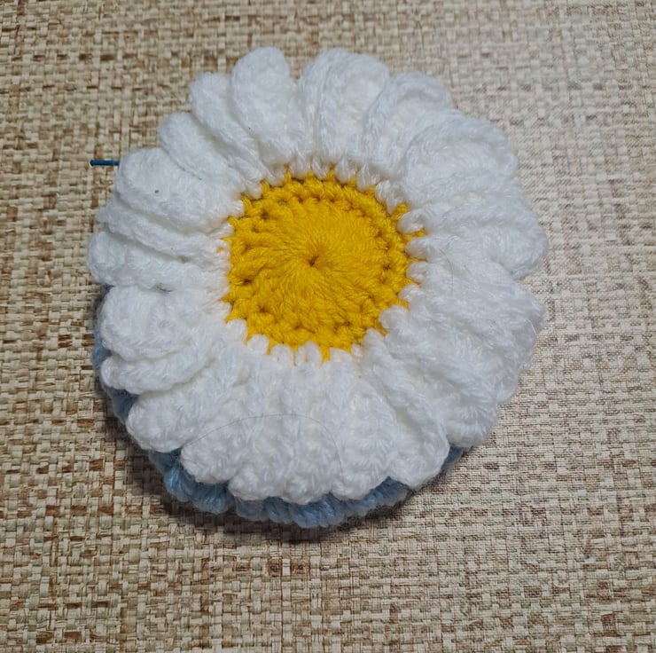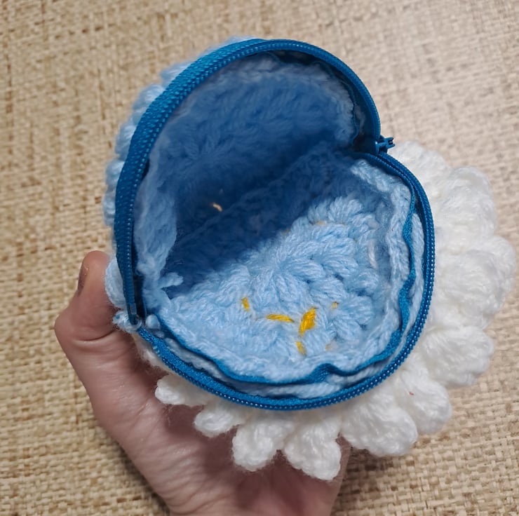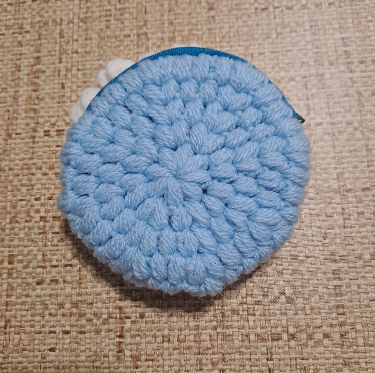 light blue round crochet purse with crochet daisy on the front. zipper on the top.