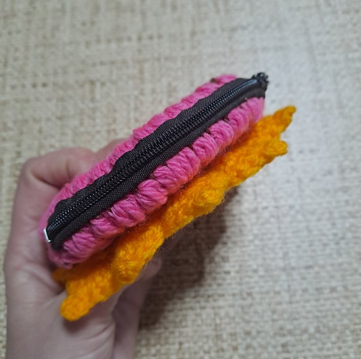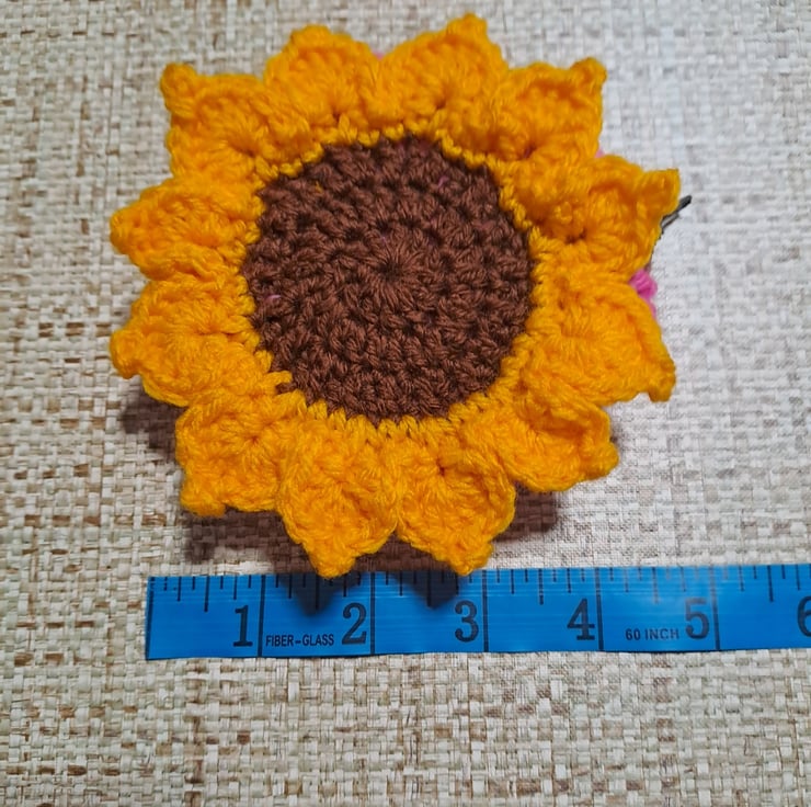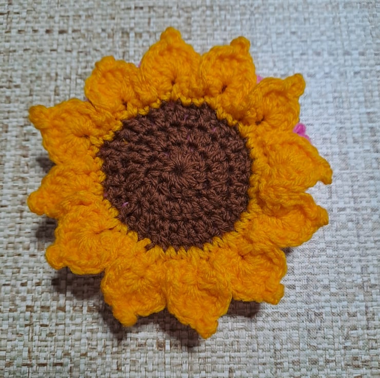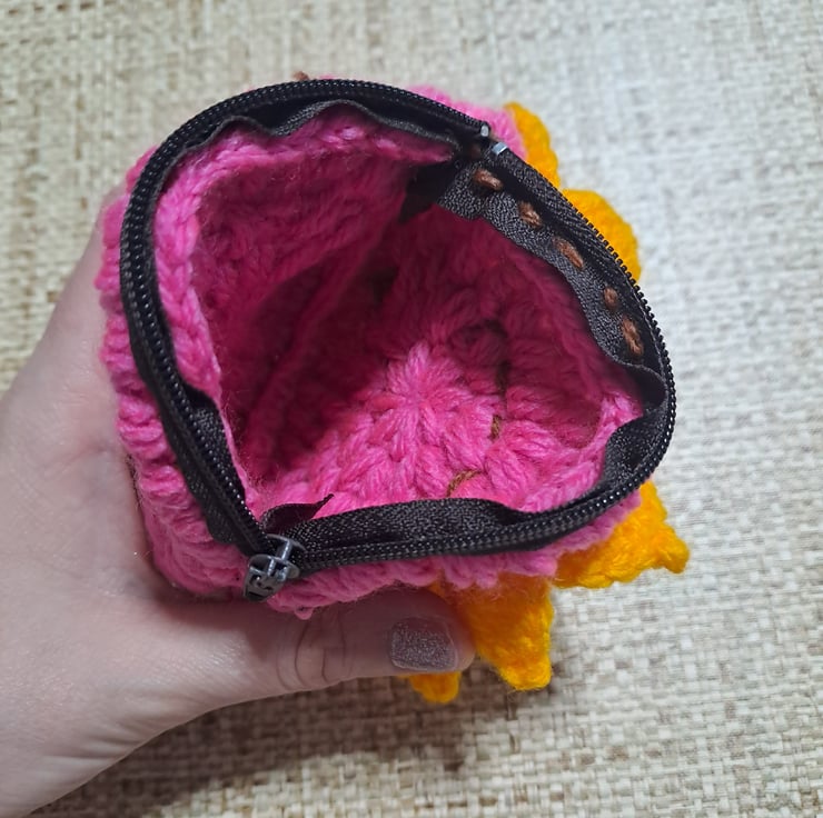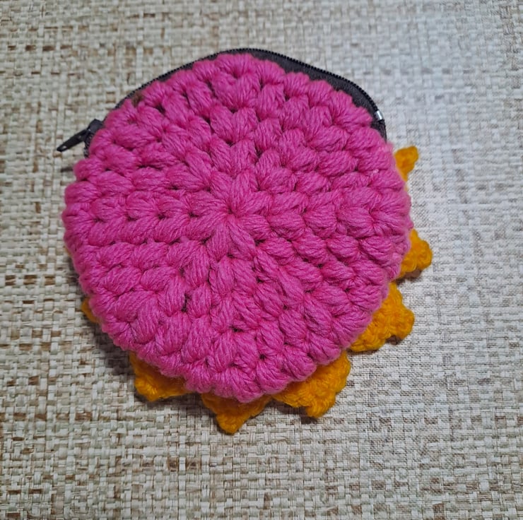 pink crochet round purse with sunflower design on the front. metal zipper on the top