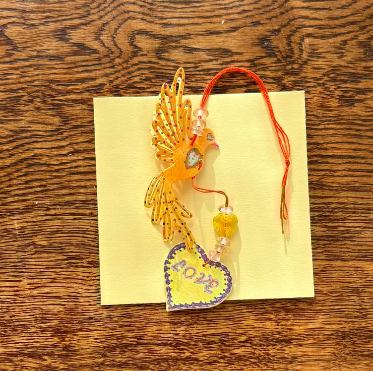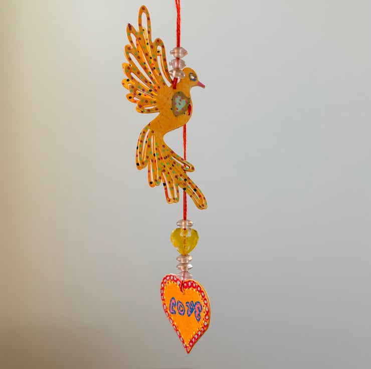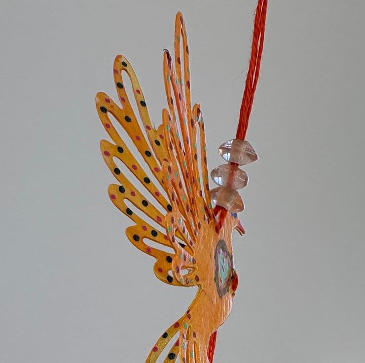 The bird and heart motifs are made from premium watercolour paper hand painted by me in a folk art style. They are strung on coloured cotton with co-ordinating glass beads.
