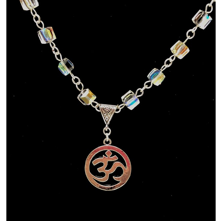 Created using this ‘Ohm’ pendant, Tibetan silver connector, clear lustre glass cubed beads finished with curb chain & a hook & eye fastener. Nickel free. Necklace measures appropriately 20” but can be adjusted to suit.