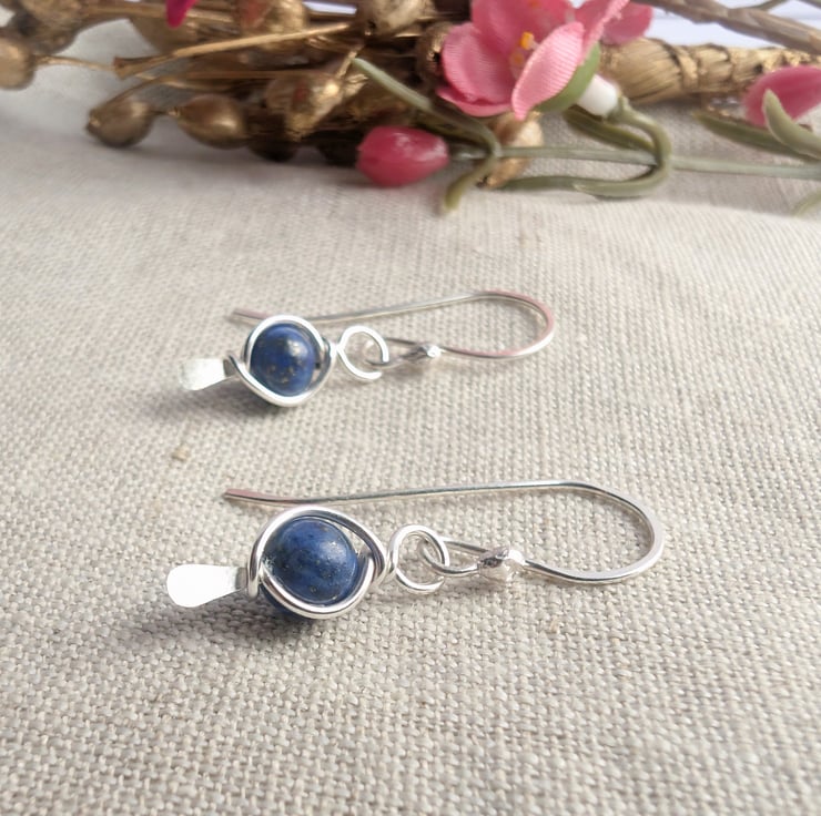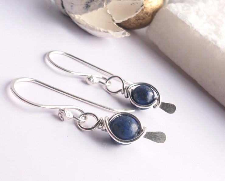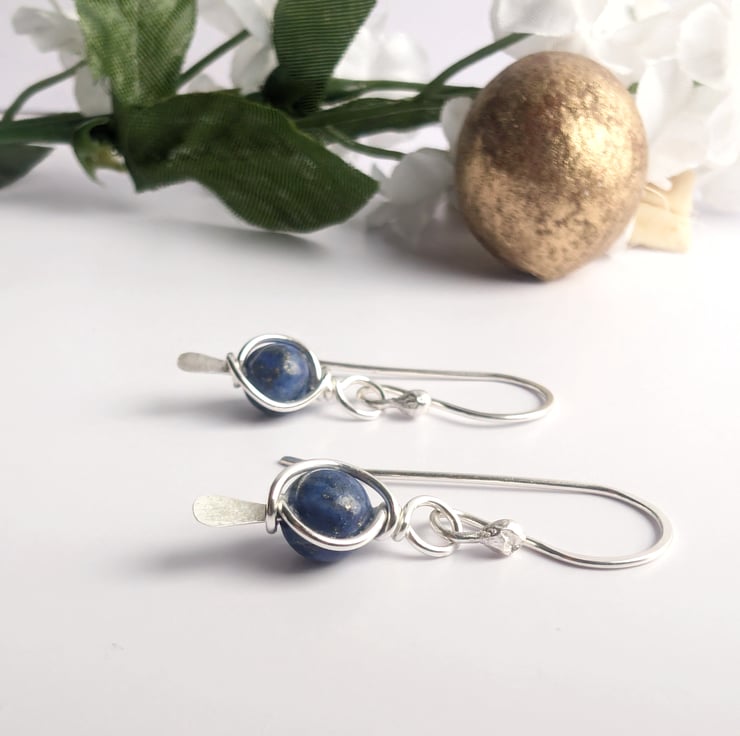 Handmade sterling silver dangle earrings featuring lapis lazuli beads. Blue lapis beads wire wrapped onto a 925 silver paddle head pin to form a frame around the bead. Choose from a bright silver shiny finish or a darker oxidised finish for a different look.