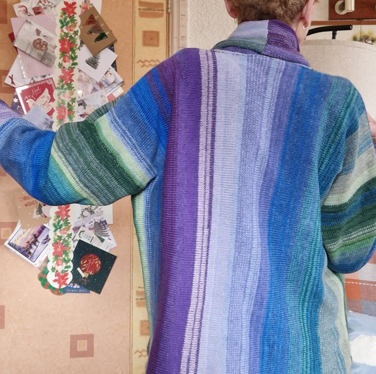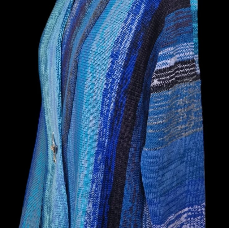 Knitted in a moisture of lambswool, with added fine acrylic for drape. Each jacket is unique, no two ever the same. Multi fit from size 10 - 16