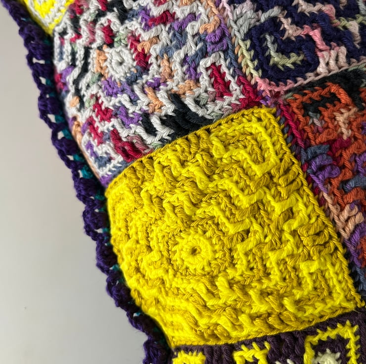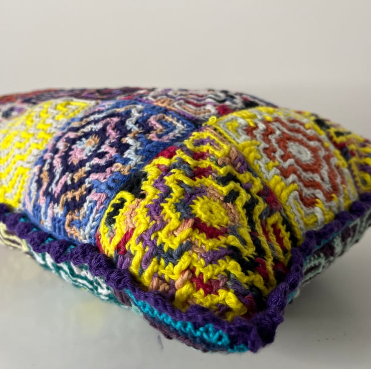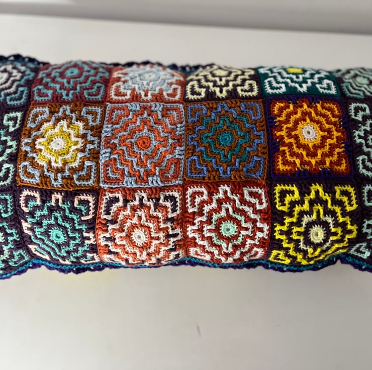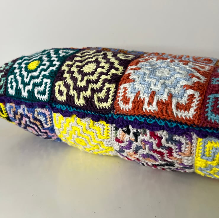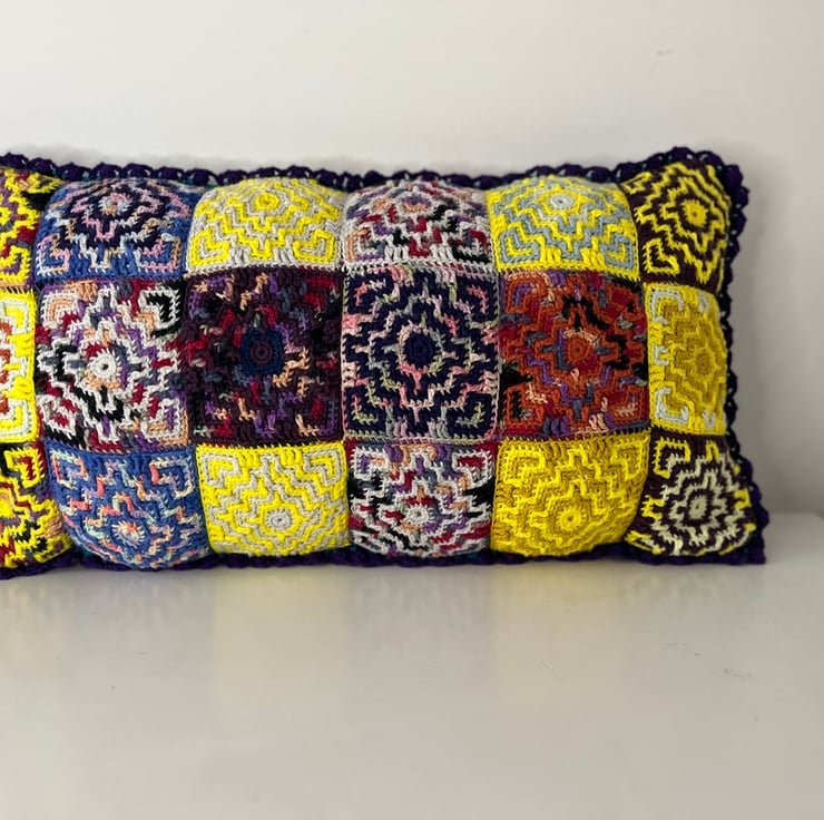 Crocheted Rainbow Cushion Pillow 30x52 cm. This handmade crochet pillow is crafted with 100% cotton yarn and filled with feathers. The pillow measures approximately 30x52 cm, and each piece I create is one-of-a-kind. The design features a bold, colorful graphic contrast on one side, while the other side showcases a gradient of yellows, blues, and purples, creating an energetic yet pixelated effect. Switch between moods and add a kick to any space!