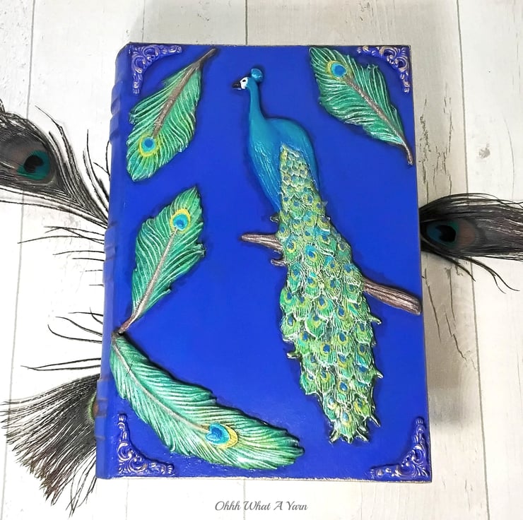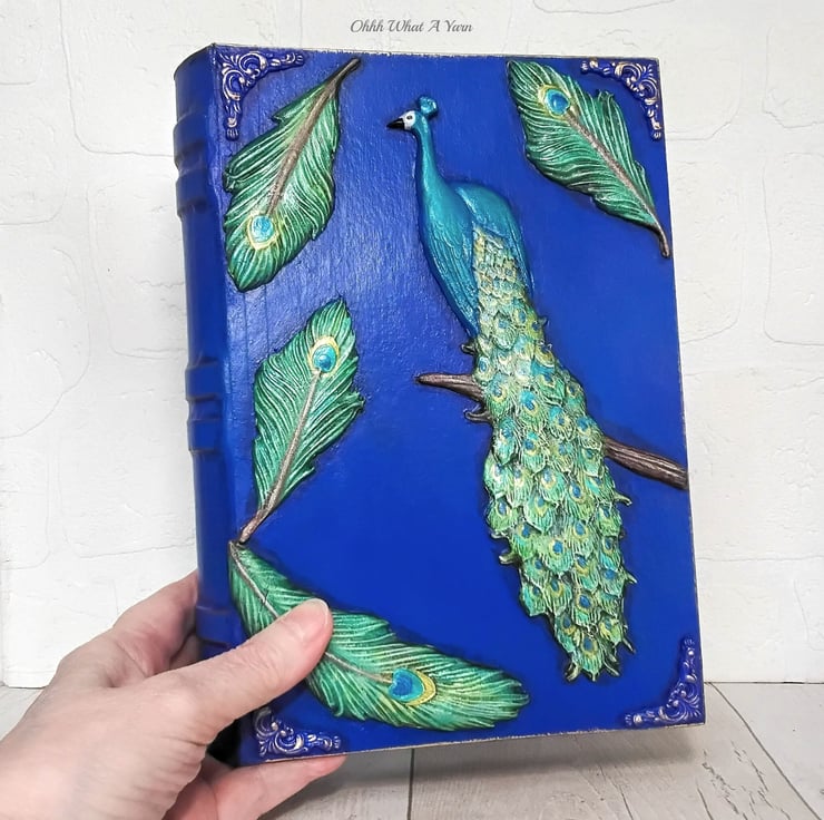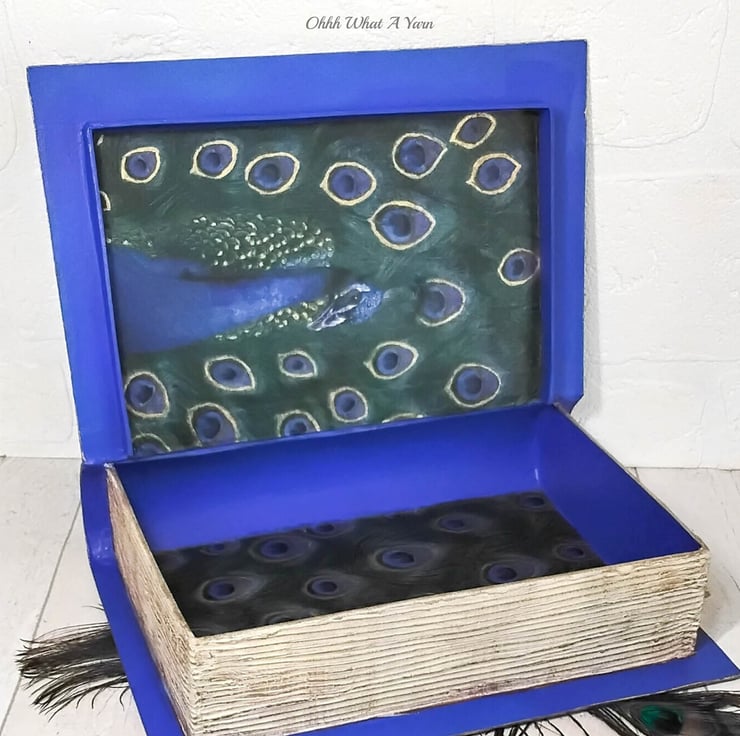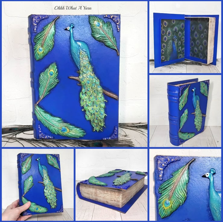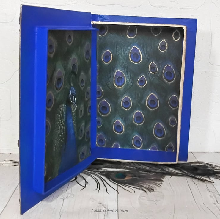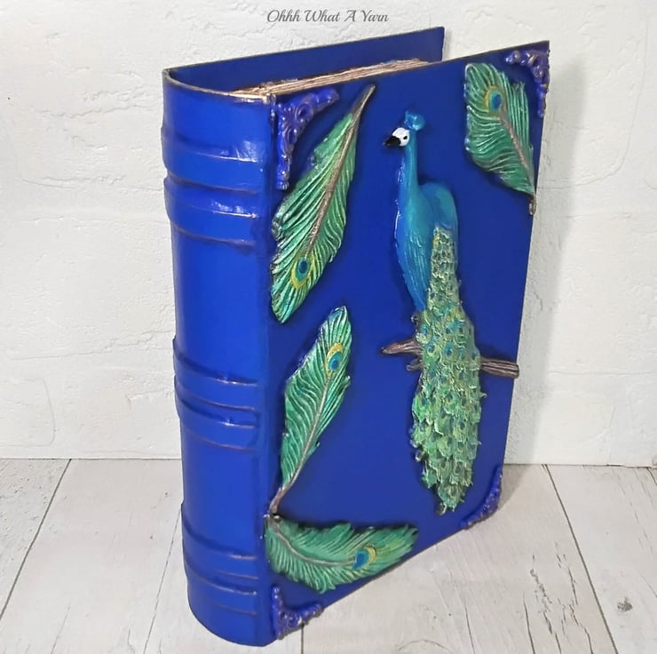 This beautiful peacock themed faux book box has been created using lots of different media.