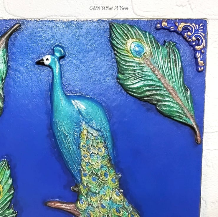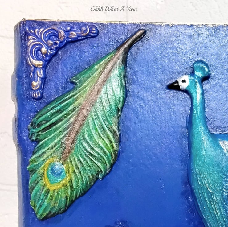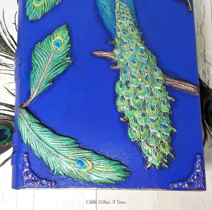 The lid is decorated with an airdry clay peacock, peacock feathers and decorative corners which have been painted with acrylic paints with accents of metallic paint giving it a lovely sparkly effect.