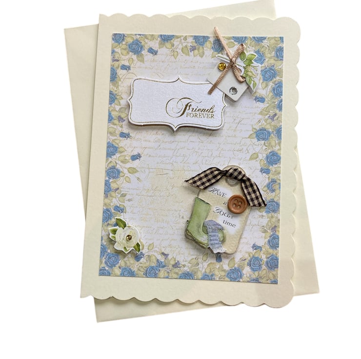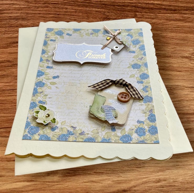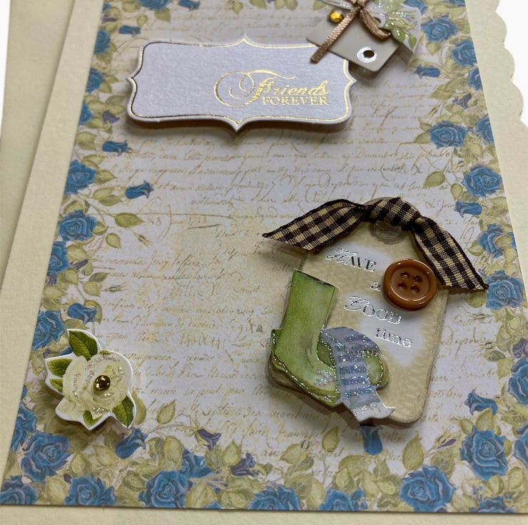 This lovely cream decoupage scalloped card features a blue rose designed card which has been layered with a 3D topper featuring wellington boots and scarf and the words Have a Good Time. The topper has a little brown gingham bow and brown button. The words Friends Forever have been added in 3D with a topper featuring a silver rose and satin bow.