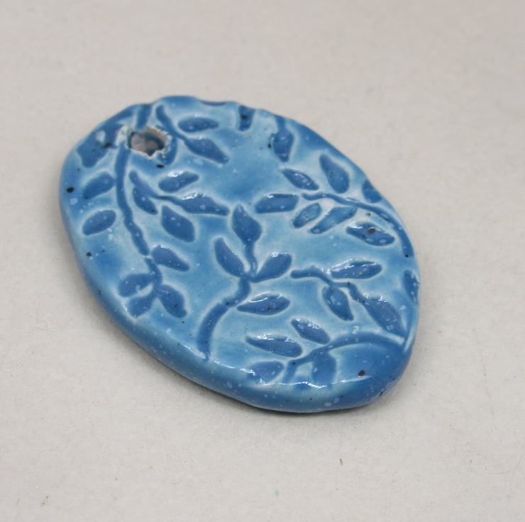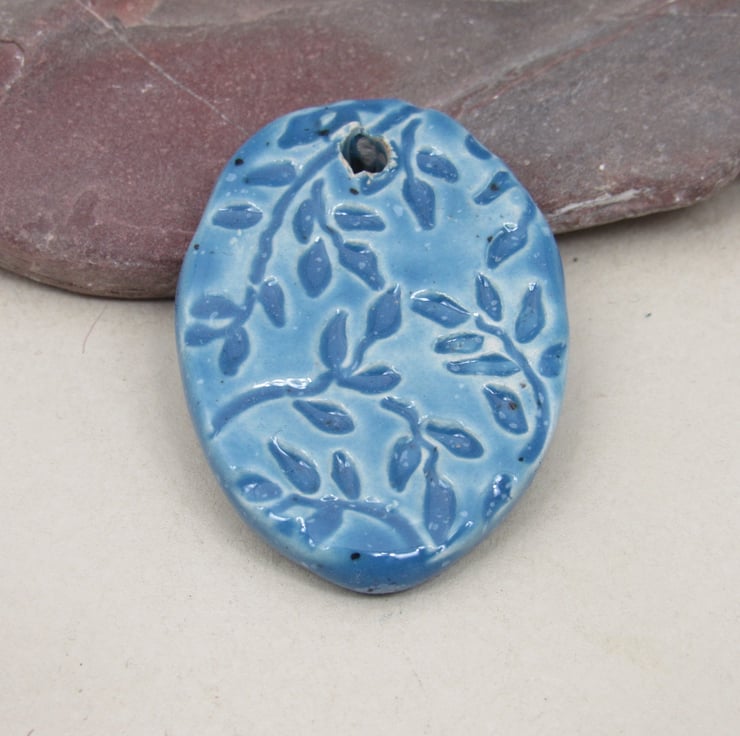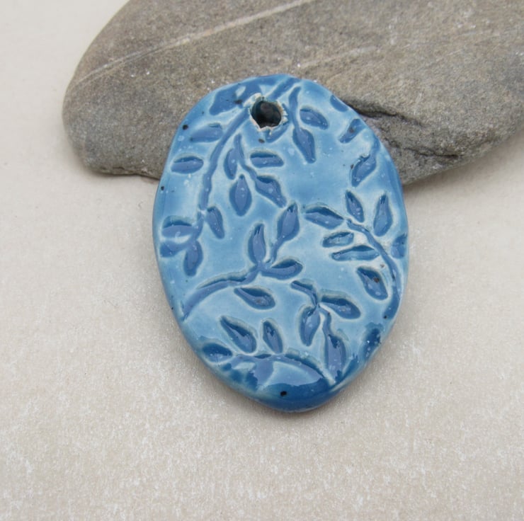Large stoneware ceramic pendant, patterned with an embossed design of tiny leaves, and finished with a lightly speckled cornflower blue glaze.