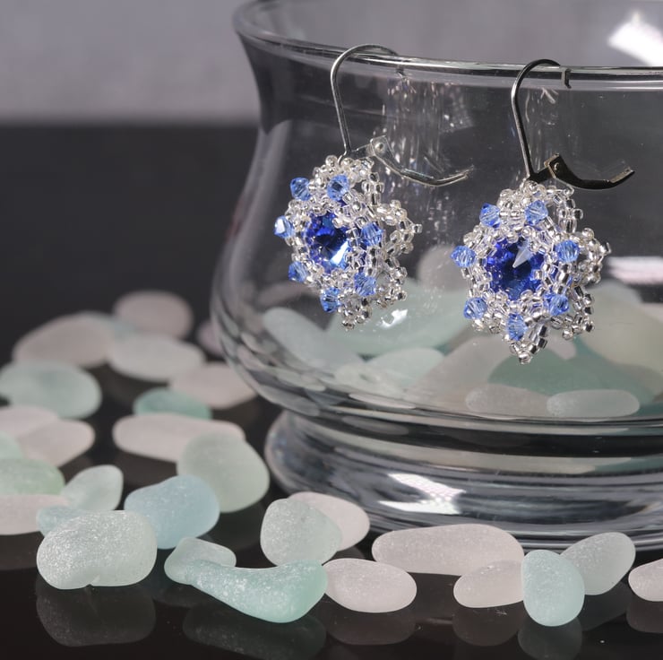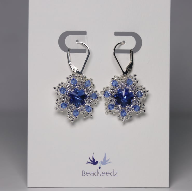 A pretty pair of sparkly earrings made from good quality sapphire blue crystal beads which have been stitched around a matching Rivoli crystal and embellished with a beaded network of silver lined crystal seed beads.