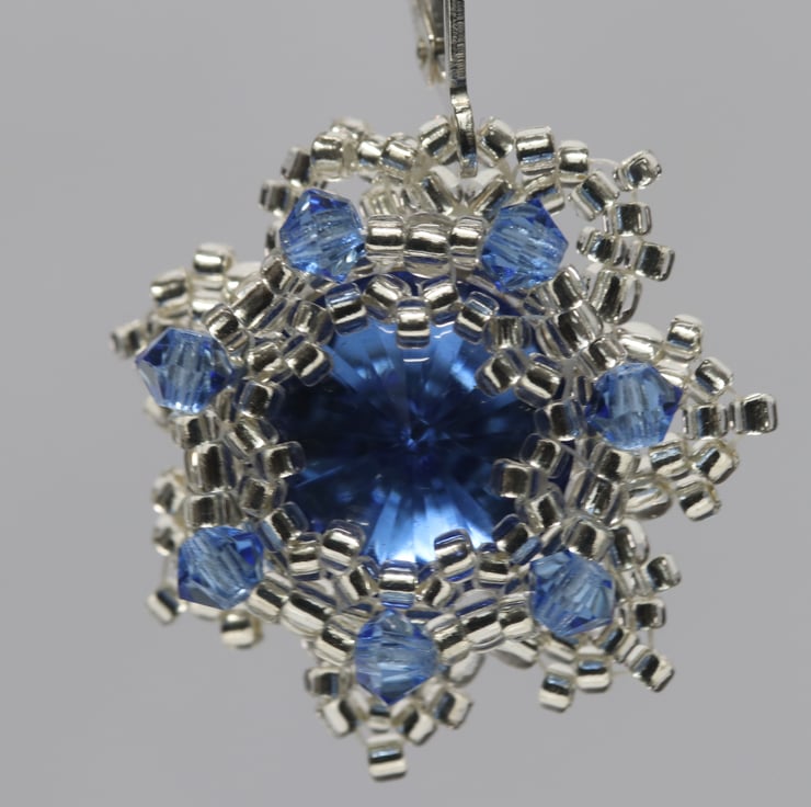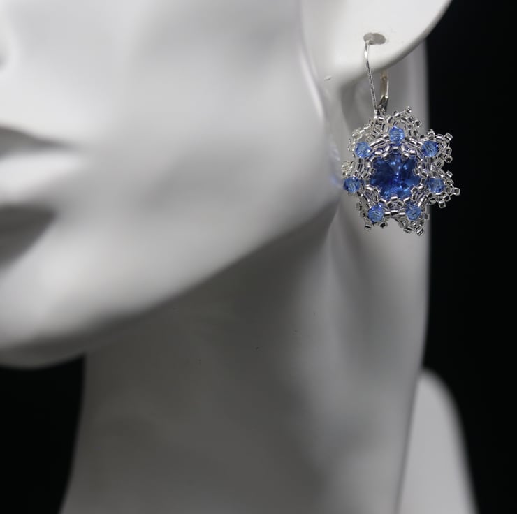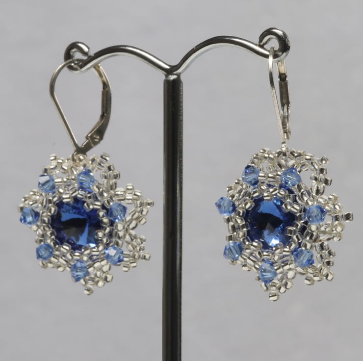 To make these earrings I have used size 11 and 15 Toho seed beads in silver-lined crystal, 10mm crystal Rivolis and 3mm bicones in saphire blue. They are made by a process called beadweaving, by which the beads are sewn together by strong Fireline beading thread (not unlike fishing line).