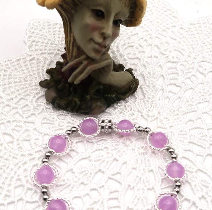 I love this Lavender Shade of Amethyst. For this Bracelet I have used 8mm Genuine Amethyst Beads and encashed them in these very pretty Silver Plated Hoops. The 4mm Spacer Beads are Stainless Steel..