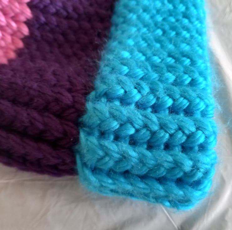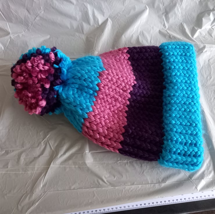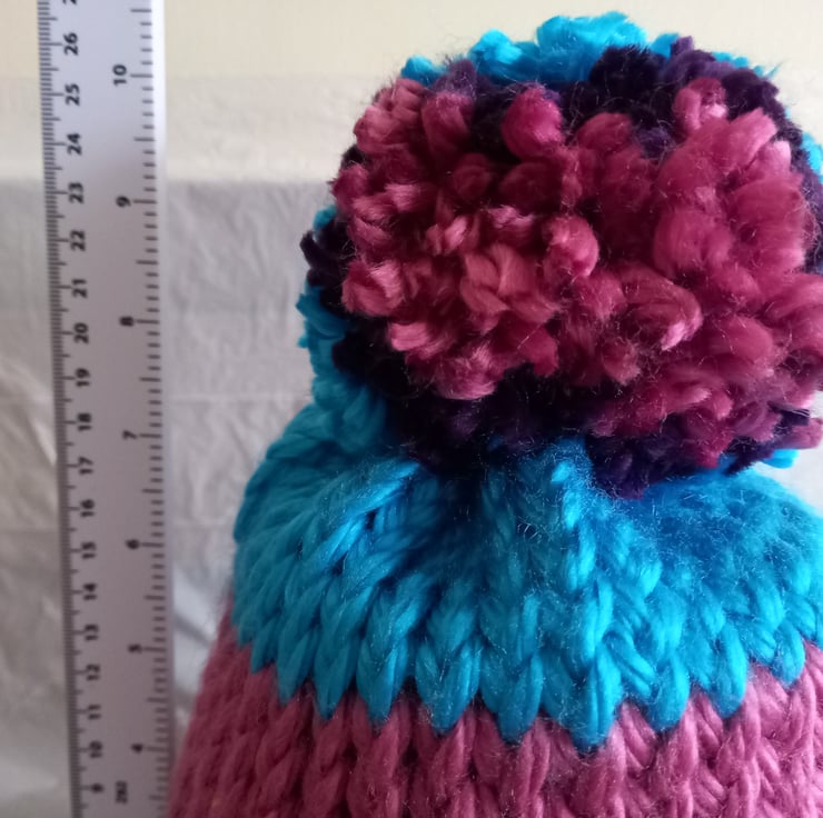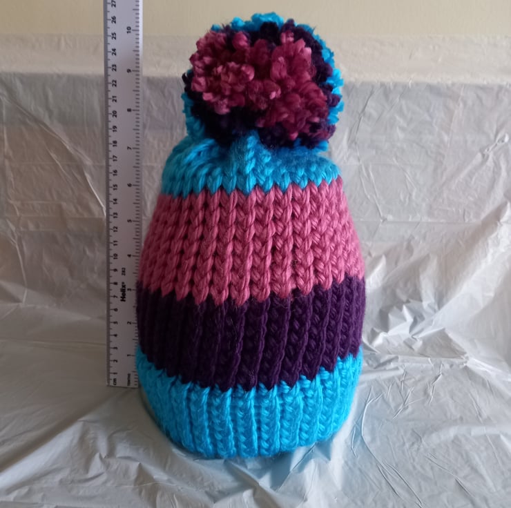 Hat & Bobble: knitted with Super Chunky 100% acrylic yarn. This hat is a 3-colour design; bright blue, deep purple & dusky pink.