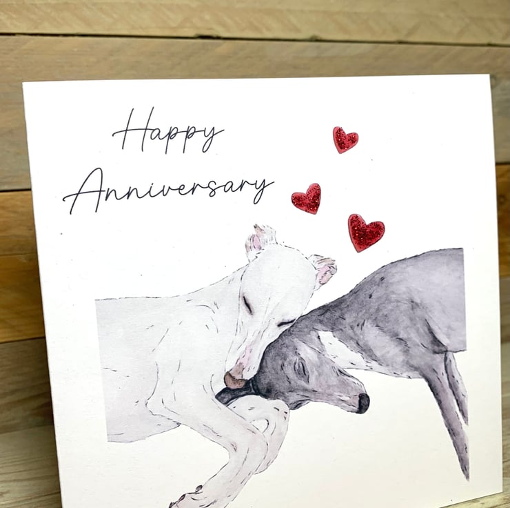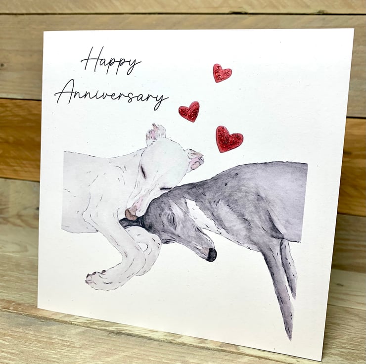 Celebrate love with this snuggling whippets anniversary card, this charming sighthound card is perfect for any dog loving couple. Hand finished with a tough of glitter on the hearts to make it extra special